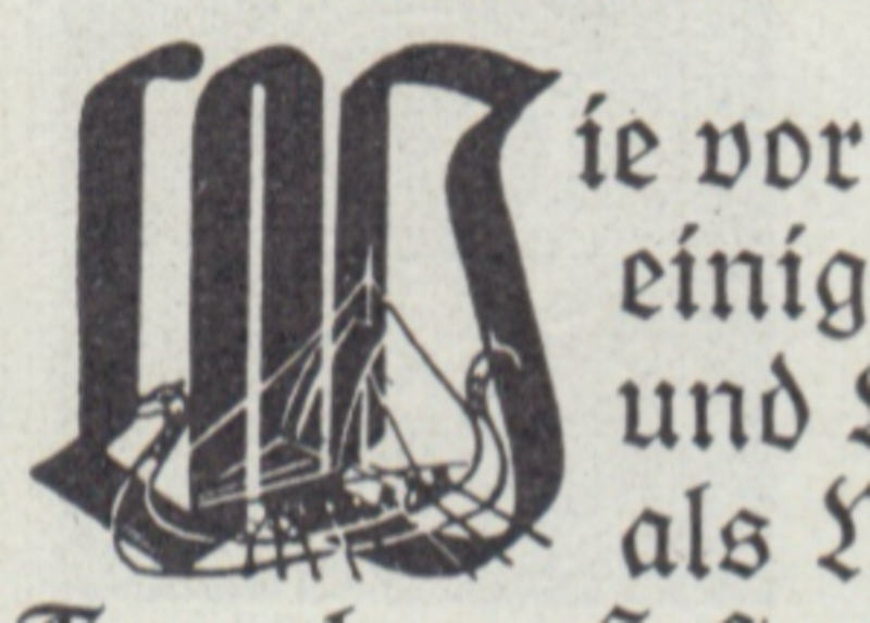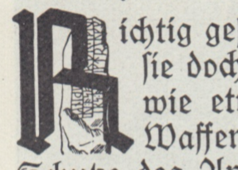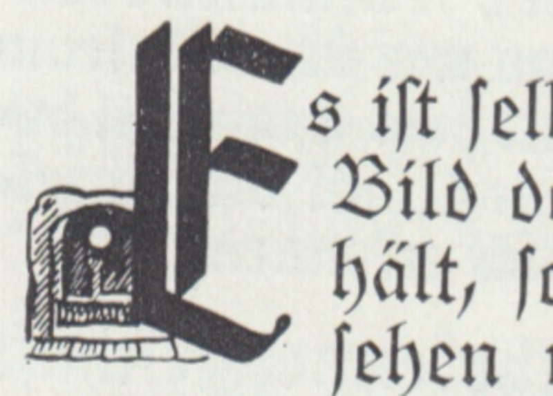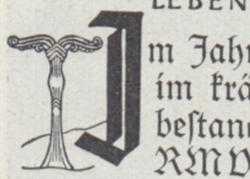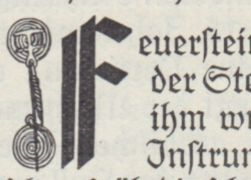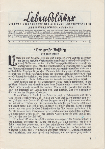 Auch im zweiten Heft aus der Reihe „Lebensblätter” habe ich wieder thematisch gestaltete, moderne Initiale gefunden. Das Heft stammt vom Juni 1937 und hat zum Thema die Geschichte der Menschheit im weitesten Sinne. Es beginnt sozusagen bei der Steinzeit und Bronzezeit. Neben den Initialen sind in diesen Heften auch sehr schöne Zeichnungen. Aber es gibt in diesem speziellen Heft noch zwei andere, typografisch interessante Entdeckungen. Dabei geht es einem um Runen und um Piktogramme. Diese werden aber einen eigen kleinen Beitrag bekommen.