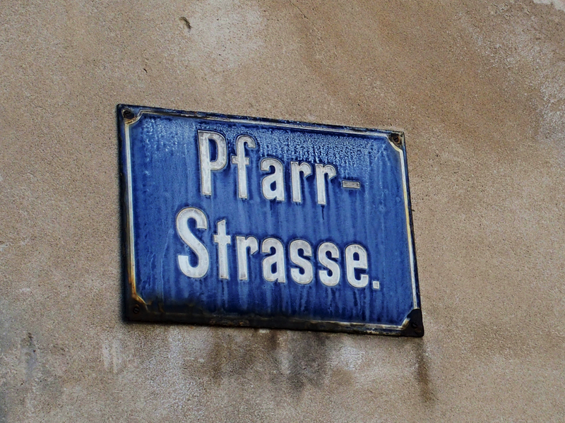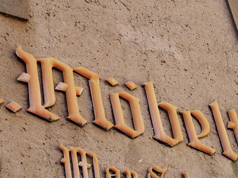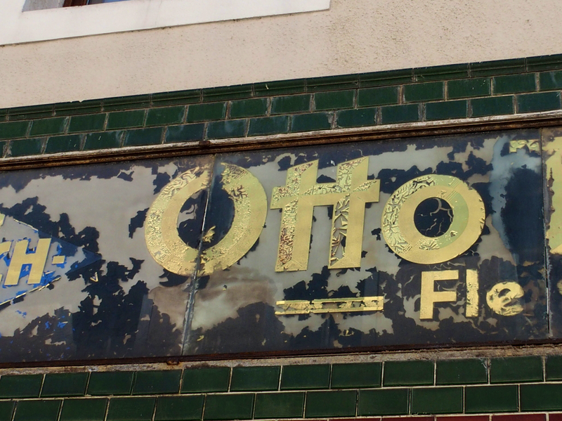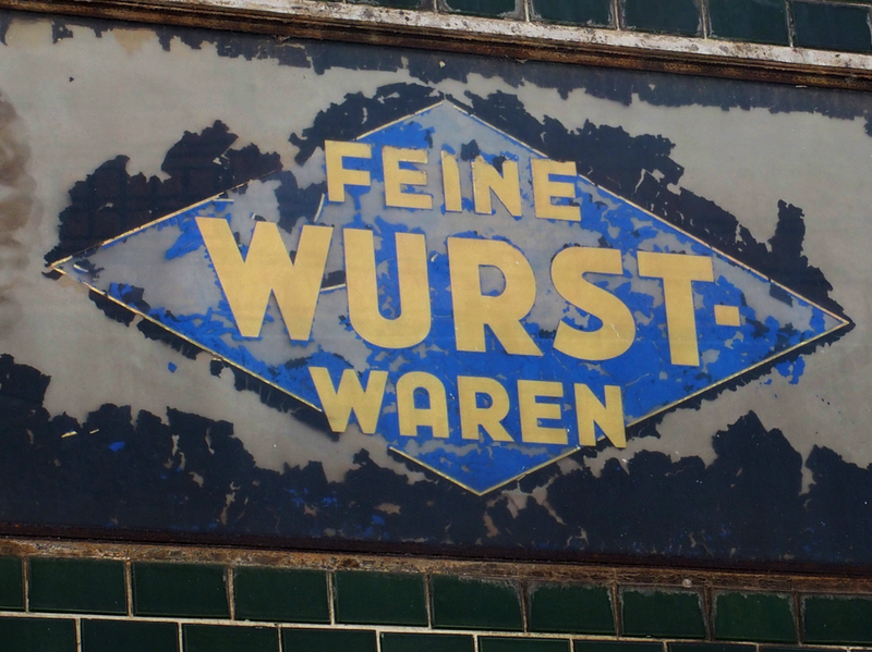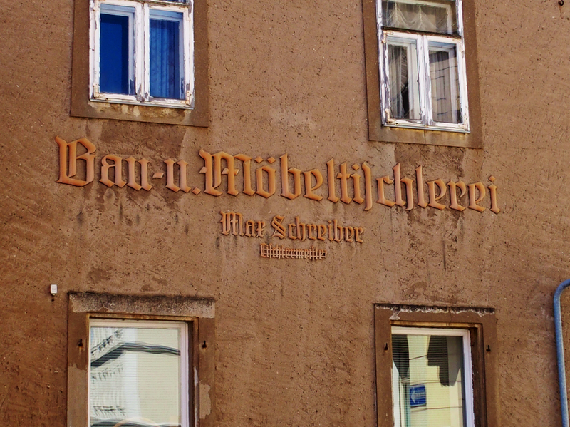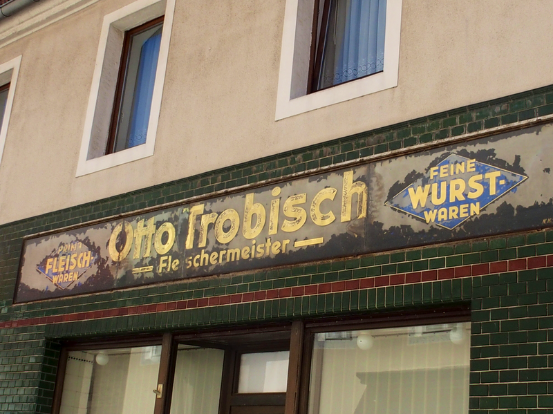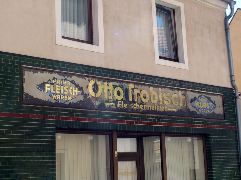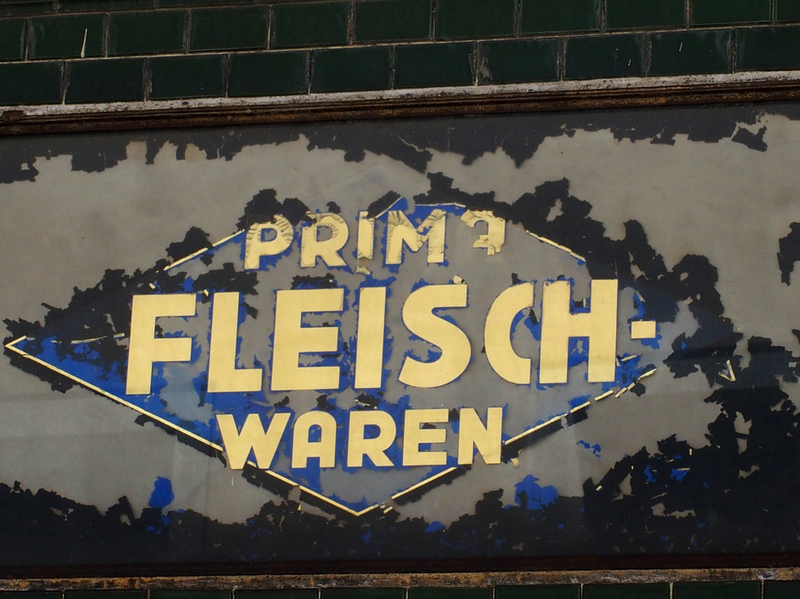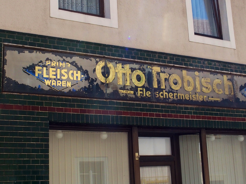 Weiter gesucht und gefunden habe ich mehrere alte Geschäftsschilder. Darunter natürlich das schon oben genannte Schild der alten Möbeltischlerei mit einer herrlich alten Patina und fast noch besser ein altes Schild einer Fleischerei. Dies war eine Glasmalerei mit Gold und hat ebenfalls schon sehr viele Gebrauchsspuren. Hoffentlich bleiben diese typografischen Fundstücke noch lange erhalten.