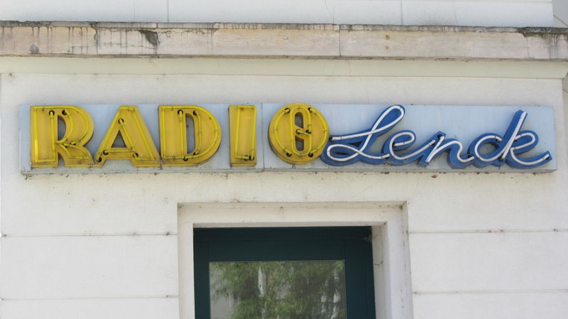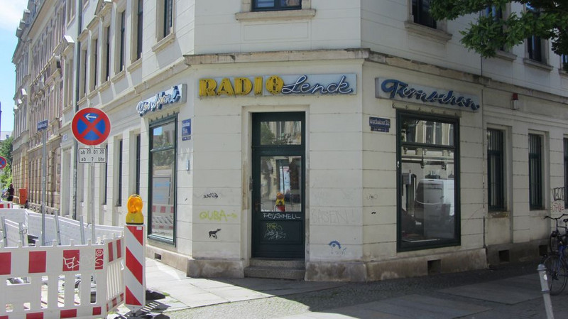 Der Radio-Lenk war ein markantes Geschäft auf der Oschatzer Straße in Mickten - eigentlich genau am Konkordien-Platz. Auch diese alte Leuchtreklame hat viel Charme. Hier sind allerdings die Buchstaben nicht einzeln wie in Übigau, sondern als ganzer Schriftzug gestaltet. Interessant sind auch die beiden Straßen-Namens-Schilder mit den verschiedenen Schreibweisen für den Konkordien-Platz mit „K” und „C”.
