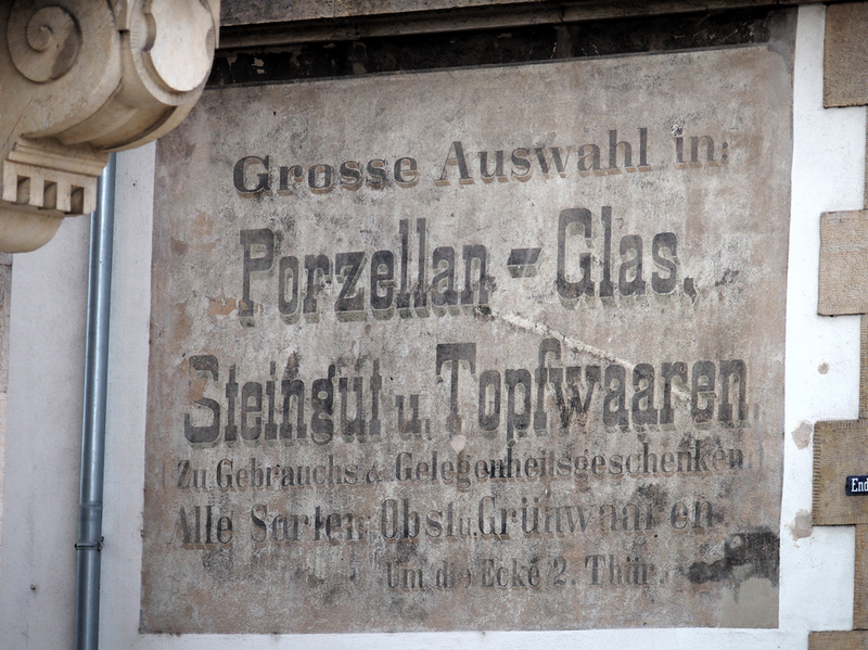 Oft wird aber ein anderer Weg gewählt. Dabei wird das Haus zwar saniert, aber die Beschriftung von der Sanierung ausgeschlossen. So bleibt die Beschriftung in ihrer historischen Form erhalten. Dies ist bei der Anzeige zu „Pozellan und Glas, Steingut und Topfwaren” auf dem Körnerplatz.