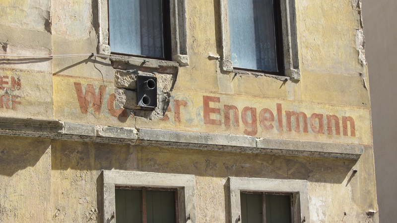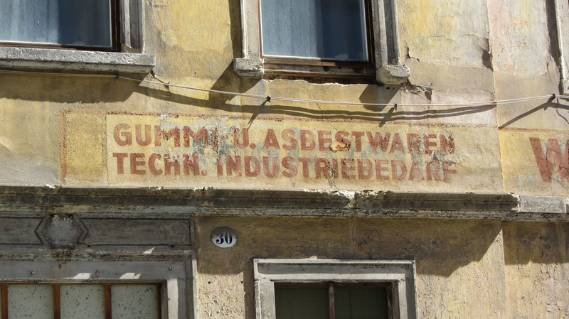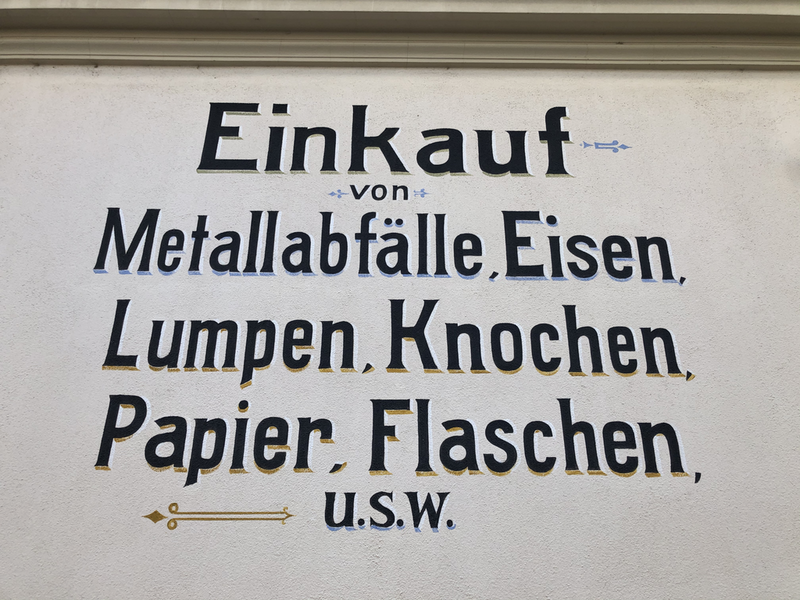 In einer Seitenstraße entdeckte ich an einem abrissreifen Haus noch eine uralte Geschäftsbeschriftung.