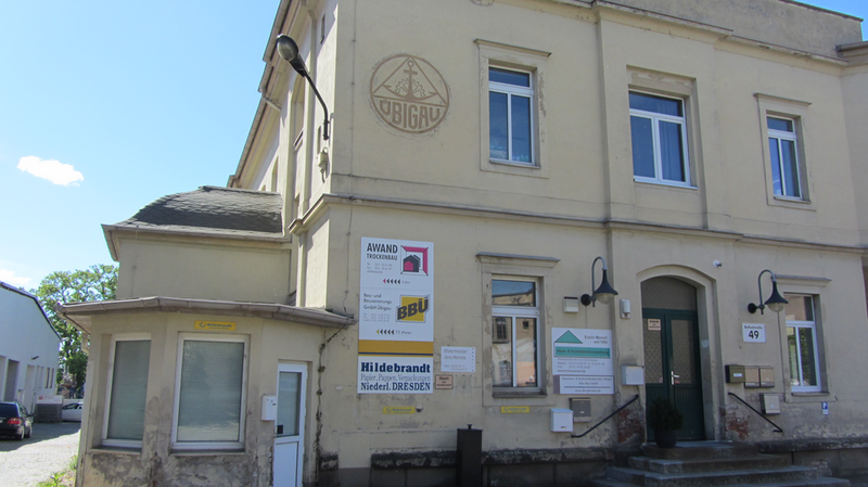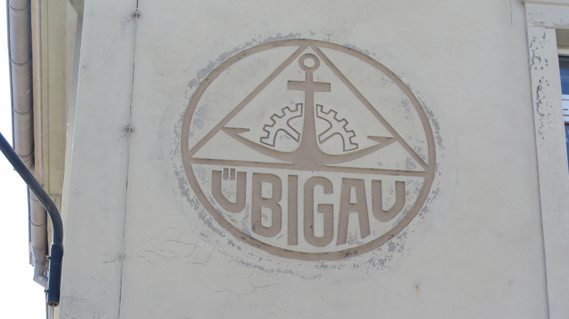 Auf dem Gelände, wo das Gebäude mit der alten Leuchtreklame steht, fiel mir ebenfalls noch eine schöne Putzschnittarbeit mit dem Zeichen von Übigau auf.