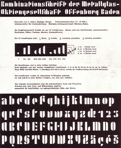 Die Kombinationsschrift von J. Albers war eine konstruktive Schrift, die sich aus 10 Grundformen zusammensetzte: