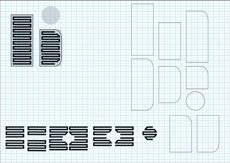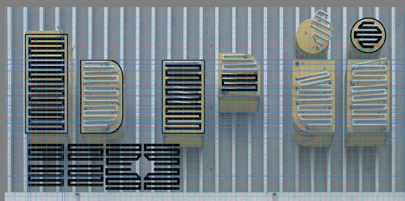 Dieses Foto benutzte ich, um die Proportionen der Buchstaben und die Abstände und Größen der Neon-Leuchtelemente festzulegen. Dazu entstand, wie bei der Starke-Post, eine Vorlagedatei. In dieser Datei wurden die Outline-Umrandungen der Buchstaben und mögliche Neon-Röhren-Varianten für das Zusammensetzen der einzelnen Zeichen zusammengestellt.