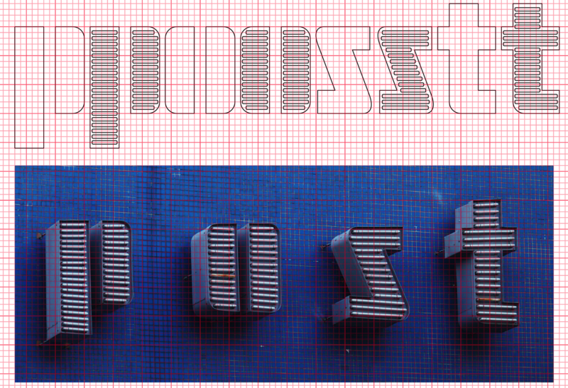Der Plan war, zuerst die vier Originalbuchstaben p - o - s - t sowohl als Konturbuchstaben als auch in Neonbuchstabenversion zu erstellen. Mit diesem Start sollten die beiden Schriften, die Starke-Post und die Starke-Post-Neon entstehen.