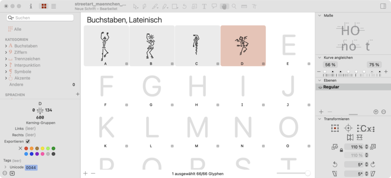 Trotzdem sind die so entstandenen Vektorzeichnungen sehr fein. Zum Schluss wurden alle Vektorstriche mit dem Befehl „Kontur erweitern” in Flächen umgewandelt, so dass sie in den Fonteditor exportiert werden konnten.