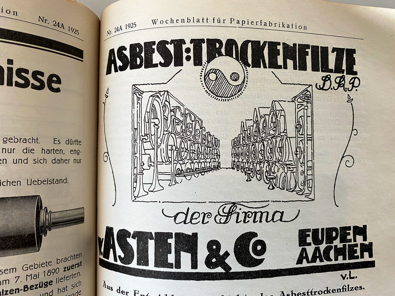 Das ganze Heft ist voll mit Texten zur Papierherstellung, zu Eigenschaften von Papieren und vor allem mit alten Werbeanzeigen von Firmen und Herstellern, die alle was mit Papier zu tun hatten. In diese Anzeigen sind teilweise herrliche alte handgemalte Schriften. Schon auf dem Deckblatt des Heftes kann man ein sehr schönes Beispiel sehen. Für mein neues Schriftprojekt wählte ich allerdings eine Werbeanzeige der Firma „v. Asten & Co" aus Eupen-Aachen aus. Diese Firma stellte (heute hochgiftige) Asbest:Trockenfilze her und schaltete dafür eine Anzeige in dem Wochenblatt. Mich begeisterte gleich die serifenlose handgemalte Großbuchstabenschrift in der Anzeige. Aus den gegebenen Zeichen soll eine Schrift mit allen Großbuchstaben, Zahlen und einigen Sonderzeichen entstehen.