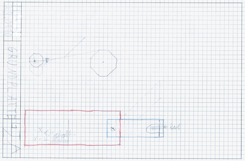 Mit dieser Entwurfsskizze wird die selbsterdachte Idee für die Lenkung des Solarautos dargestellt. In Ermangelung der Kenntnisse und Fertigkeiten rechtwinkliger bzw. perspektivischen Projektionen wurden farbige Stifte eingesetzt. Für diesen Fall und in diesem Umfang durchaus vertretbar und erwünscht, da hier mit Bleistift vorgezeichnet und lediglich zur besseren Verdeutlichung des Funktionszusammenhangs die Farbstifte eigesetzt wurden.