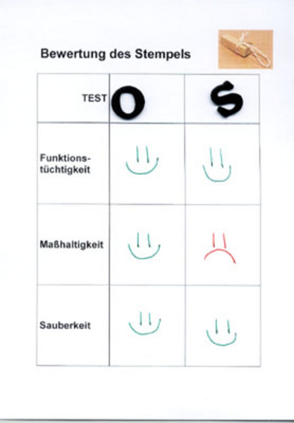 Hinweis auf Unterlage und Wirksamkeit der Farbe des Stempelkissens - Einheften von Technologie, Bewertungsblatt und Stempeltestblatt