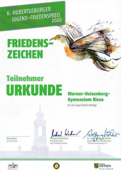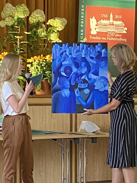 Nachdem die SchülerInnen Elisa Otto, Hannah Metzner, Luise Wendt und William Kaniuth Anfang September erfuhren, dass sie für den HUBERTUSBURGER JUGEND-FRIEDENSPREIS 2020, der unter der Schirmherrschaft des Ministerpräsidenten steht und vom Freundeskreis Schloss Hubertusburg initiiert wurde, nominiert wurden, war die Freude groß. Sie wurden am 19.09.2020 nach Wermsdorf ins Schloss Hubertusburg zur Preisverleihung eingeladen. Die unterschiedlichen Arbeiten, die sich mit dem Thema „Friedenszeichen“ auseindersetzen und Titel wie "gemEINsam" oder "All together - now!" tragen, laden den Betrachter dazu ein, sich mit der derzeitigen Lage in und der Politik von Europa auseinanderzusetzen. Sie appellieren klar an ein einheitliches Denken und gemeinsames Handeln, gerade in diesen Zeiten, in denen die Bilder von Moria allgegenwärtig sind und man sich auf unsere gesellschaftlichen Grundwerte rückbesinnen sollten – so die Erläuterungen von Elisa Otto bei der Vorstellung ihres Werkes "gemEINsam". An eben diese Momente erinnerte auch der Vorsitzende des Freundeskreises Schloss Hubertusburg e.V. Wermsdorf Herr W. Köhler in seiner Laudatio.