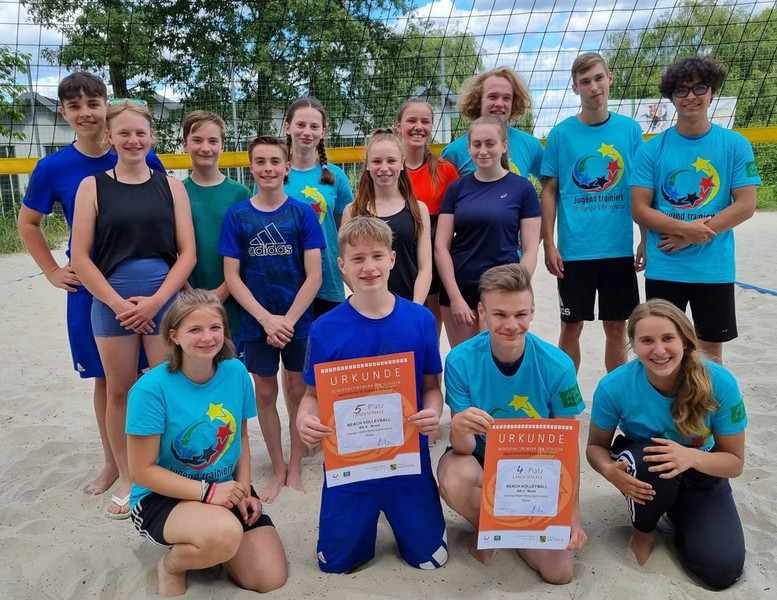 Dienstag folgte die Wettkampfklasse IV. Mit dem Sieg im Landesfinale in der Halle ist auch das Selbstbewusstsein gewachsen. Doch beim Beachvolleyball spielen 2 Jungen und 2 Mädchen nach Hallenregeln. Vier Mannschaften stellten sich diesem Turnier. Ohne Satzverlust sicherten wir uns gegen den Zweitplatzierten, das Gymnasium Wilkau/Haßlau (42:27), dem Dritten, das C.-Ehrenberg Gymnasium Delitzsch (42:31) sowie dem Goethe-Gymnasium Bischofswerda (43:32) den Sieg im Turnier und haben auch hier das Landesfinale gewonnen.