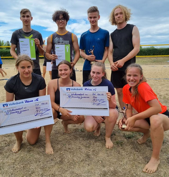 Am Mittwoch folgte die 22. Auflage der von der Barmer organisierten Schulmeisterschaft im Beachvolleyball in zwei Altersklassen. Im Turnier bis Klasse 10 spielten 15 Mannschaften in 4 Vorrundengruppen um den Einzug ins Viertelfinale. Leider schaffte unser 2. Team diesen nicht. Die ersten Mannschaft tat sich etwas schwer. Viele kleine Fehler schlichen sich ein. Im Gegensatz zum Beachvolleyball spielen in diesem Turnier 2 Mädchen und 2 Jungen auf dem Feld nach Hallenregeln. Nach kleinen Startschwierigkeiten im ersten und zweiten Spiel, sicherte sich die erste Mannschaft den Einzug ins Viertelfinale und anschließend ins Halbfinale gegen die Triebischtal Oberschule aus Meißen. Im Finale wartete die Mannschaft vom St. Afra Gymnasium Meißen. Souverän gelang es den Heisenbergern, ihren Titel zu verteidigen.