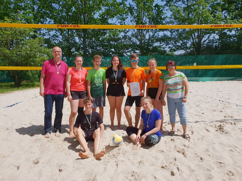 Die Mädchen und Jungen des Dresdner Gymnasiums Bürgerwiese erwiesen sich als der erwartet schwere Gegner um den Einzug ins Landesfinale. Unsere Mädchen, eine aktive Leichtathletin sowie Tischtennisspielerin, konnten ihr Spiel 21:14 und 21: 15 gewinnen. Anschließend spielten die Jungs gegen aktive Volleyballer des VC Dresden und sammelten immerhin 8 und 13 Punkte. So musste abschließend das Mix- Spiel die Entscheidung bringen. Schnell wurde deutlich, das sich hier zwei Teams auf Augenhöhe gegenüber standen. So stand es nach 2 Sätzen 1:1 (17:21, 21: 15). Alle fieberten mit, feuerten die Spieler noch einmal an. Eigene Fehler wurden reduziert, die Aufschläge sicherer und druckvoller, so dass mit 15:11 der Sieg gelang und sich die Mannschaft für das am 2. Juli in Dresden stattfindende Landesfinale qualifizieren konnte. Wir wünschen dort dem Team viel Erfolg.