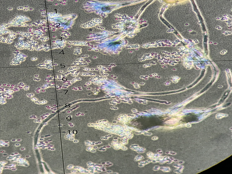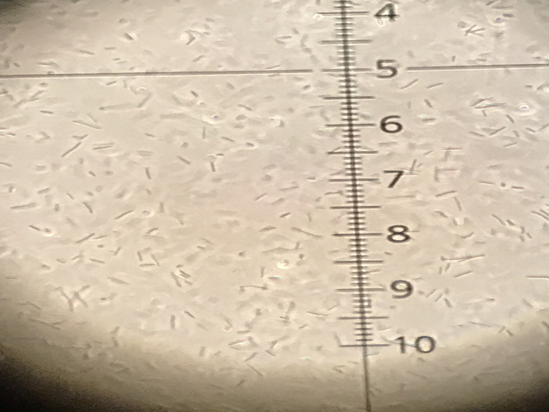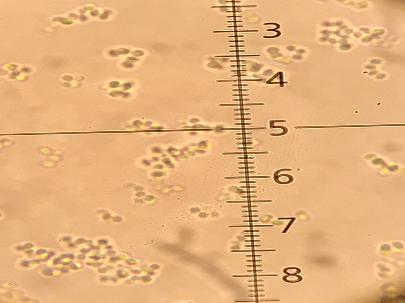 Fasziniert waren alle bei der Auswertung der in der Schule bzw. auf dem Schulgelände gewonnenen Luftkeim-Proben. Vielfältig und bunt präsentierten sich die verschiedenen Bakterien und Pilze unter dem Mikroskop bei 400 bis 1000 facher Vergrößerung.