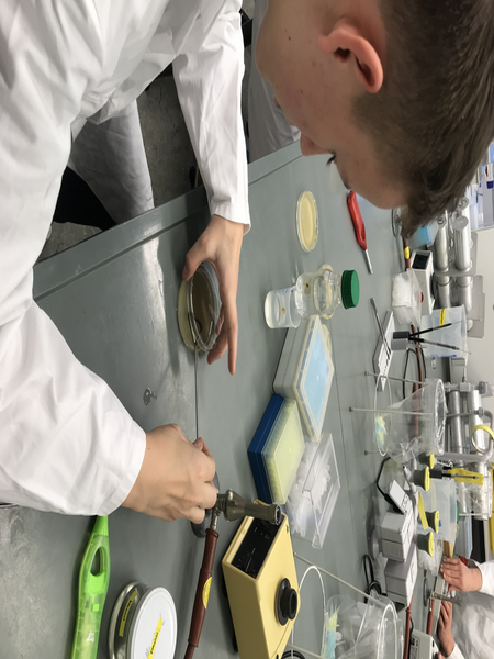 Unter fachkundiger Anleitung erlernten sie typische Arbeitstechniken wie das sterile Arbeiten, die Bestimmung der Anzahl lebender Keime in einer Probe oder die Überprüfung einer Probe auf Reinheit. Die Schüler testeten auch, inwieweit Händewaschen bzw. Desinfizieren tatsächlich die Anzahl an Keimen auf der Haut reduziert.