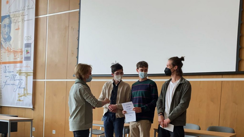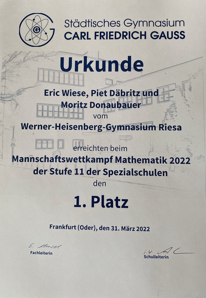 Während ihre Mitschüler noch gemütlich im Bett lagen, ging es am 31. März 2022 um 5:15 Uhr für Eric Wiese, Piet Däbritz und Moritz Donaubauer in Begleitung von Mathematiklehrerin Frau Dr. Förster mit dem Zug los zum Mannschaftswettkampf Mathematik der Stufe 11 der Spezialschulen nach Frankfurt (Oder). Nach einer mehrstündigen Zugfahrt und einem 40-minütigen Spaziergang erreichte das Team um 10:15 Uhr das Städtische Gymnasium Carl Friedrich Gauß. Eine kurze Begrüßung und dann ging es schon los. Innerhalb von drei Stunden mussten drei komplexe mathematische Probleme gelöst werden. Dass sich an diesem Tag das frühe Aufstehen gelohnt hatte, zeigte sich bei der Siegerehrung: Die WHG-Auswahl erreichte den ersten Platz! Mit jeweils 20€ Preisgeld ging es wieder zurück nach Riesa. Da konnte auch die einstündige Zugverspätung die gute Laune nicht trüben.