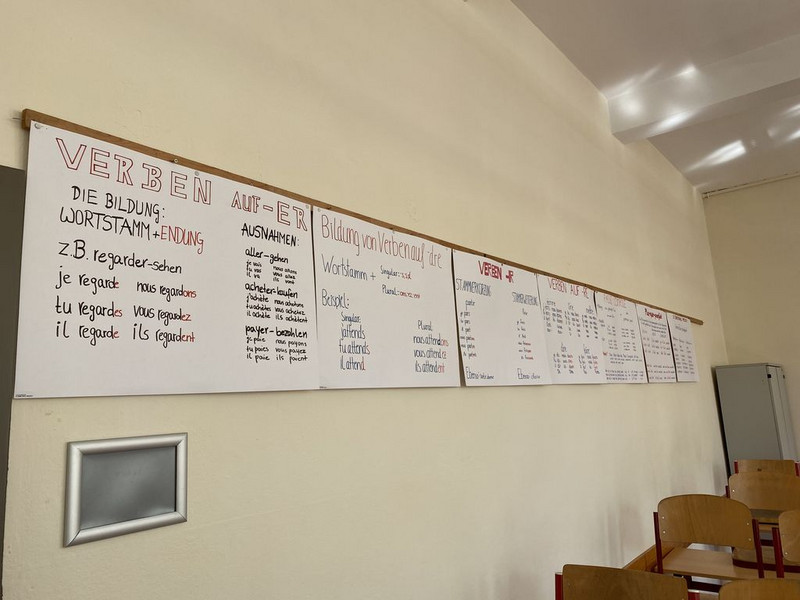 Damit sich unsere Sprachenlerner überall auf der Welt aktiv mündlich und schriftlich spontan, fließend und strukturiert auf Französisch verständigen können, ist das wichtigste Ziel des Französischunterrichts die Fähigkeit, mit anderen zu kommunizieren, d.h. durch Lesen, Hören, Sehen und Sprechen. Um dieses Ziel zu erreichen, werden im Unterricht Wortschatz und Grammatik kontinuierlich erlernt und in den unterschiedlichsten authentischen Gesprächssituationen angewendet. Spannende Projekte, französische Filme im Unterricht und in Besuchen der Schulkinowoche Cinéfête, Musik, Literatur und Theater, aber auch verschiedene Sprachspiele werden hierbei eingebunden und sollen Freude am Sprachenlernen und Sprachgebrauch vermitteln und motivieren, auch außerhalb der Schule Erfahrungen mit der Fremdsprache zu machen.