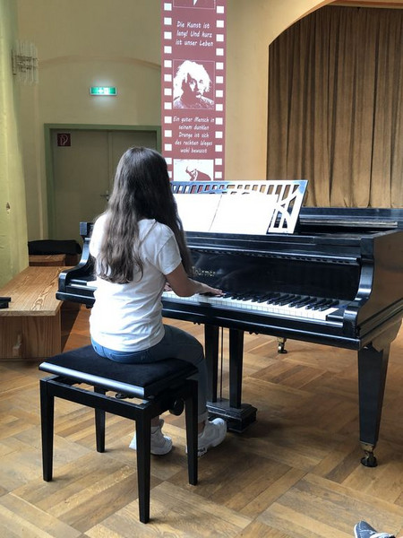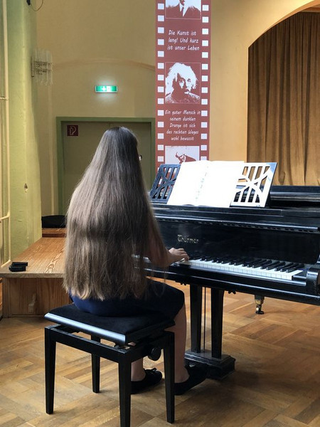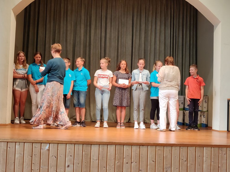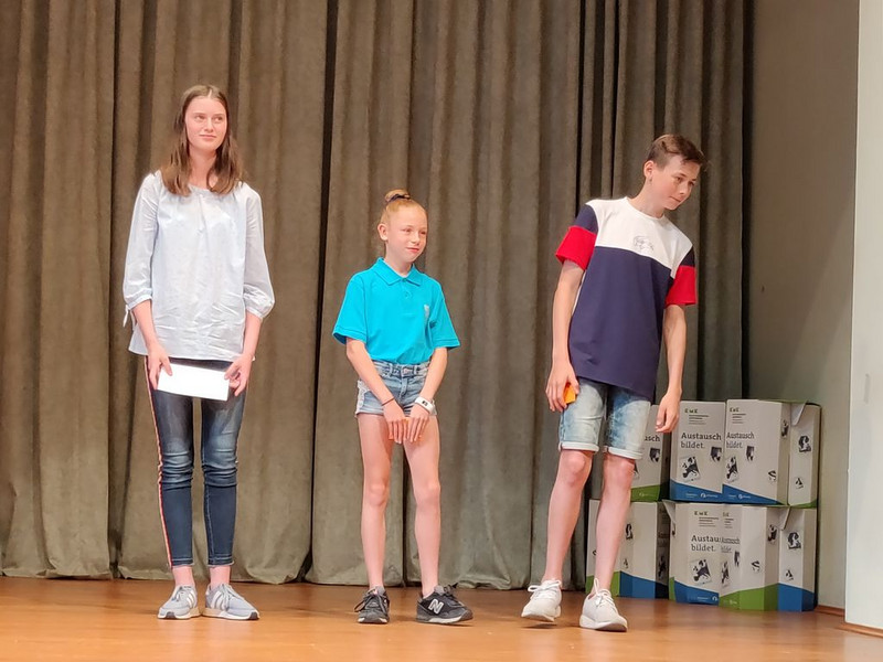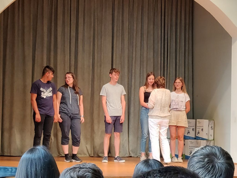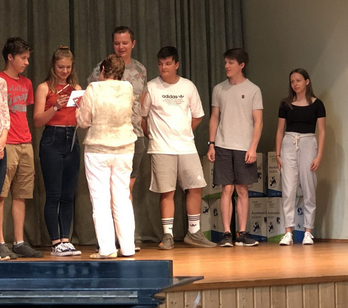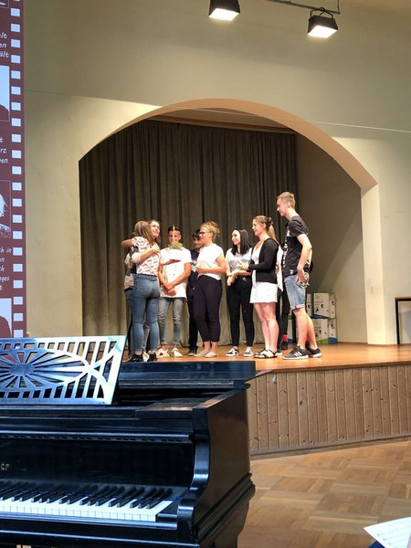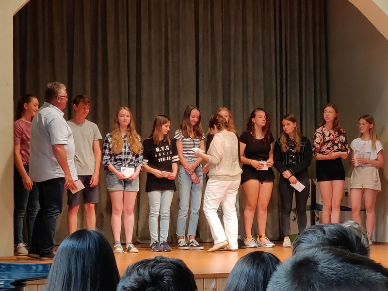 Im Anschluss an die Zeugnisausgabe in den einzelnen Klassen fand für alle Schüler, aufgeteilt in zwei Gruppen (Klassen 5 bis 7 sowie 8 bis 11) in der Aula eine feierliche Auszeichnungsveranstaltung statt, begleitet von Musik am Klavier.