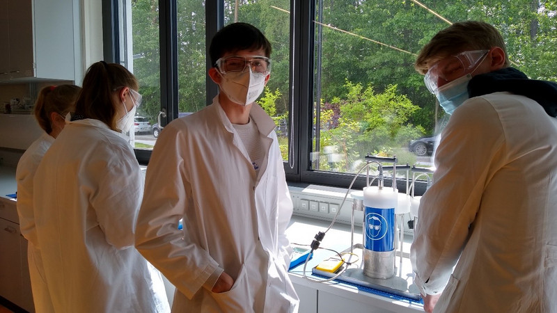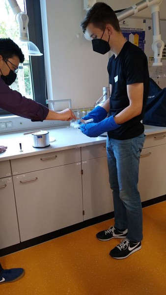 Bei der letzten Station wurde es dann gefährlich. Nur mit Kittel und Schutzbrille bekleidet durften die Widerstand-Temperaturkurven verschiedener Leiter aufgenommen werden. Augenscheinlich interessanter als die Aufnahme der Messkurve war jedoch die vorherige Prüfung, ob auch noch genügend flüssiger Stickstoff im Messgefäß war. Letzteres Kühlmittel war auch der Grund für die Schutzausrüstung.