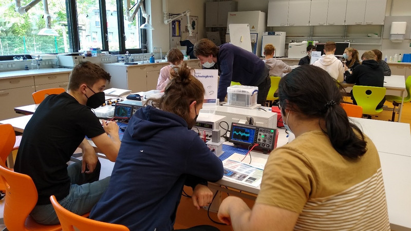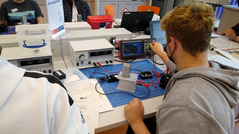 Als nächstes ging es weiter mit der Untersuchung eines elektromagnetischen Schwingkreises. Mithilfe einer Simulation und eines echten Schwingkreises wurde ermittelt, welche physikalischen Größen die elektromagnetische Schwingung beeinflussen. Die Schwingung möglichst perfekt auf dem Oszilloskop darzustellen, war dabei die größte Herausforderung an diesem Tag.