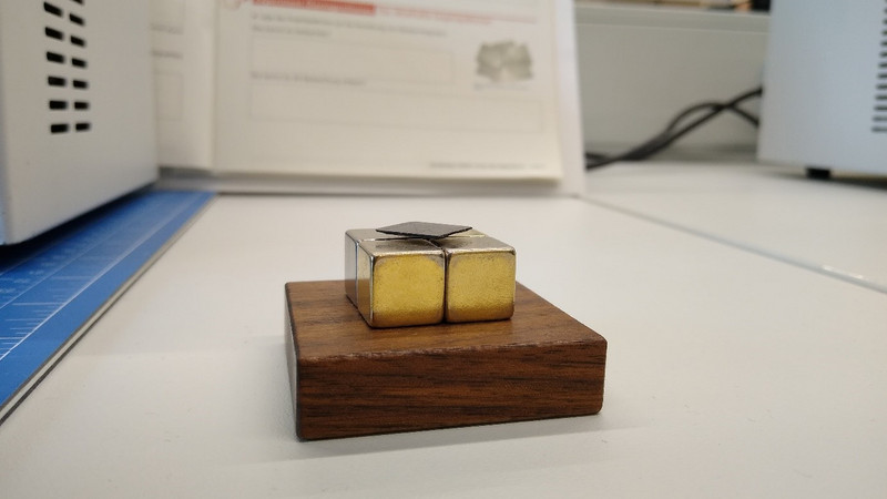 An der ersten Station wurden die Entstehung und die Arten des Magnetismus kurz erklärt und dann mussten die Schüler auch schon verschiedene Materialien den drei Magnetismusarten zuordnen. Als Untersuchungsgerät diente ein Spulenpaar und eine Pendelvorrichtung. Highlight der Station war jedoch das Graphitplättchen, dass mit Hilfe von speziell angeordneten Magneten zum Schweben gebracht wurde.