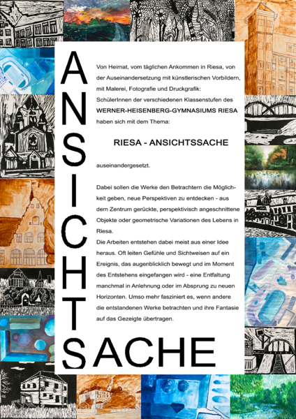 Egal ob 100m Riesa, Riesas Facetten im Druckverfahren oder einfach einmal den Blickwinkel verändern – die spannenden Objekte, die in Malereien und Grafiken von Schülerinnen und Schülern festgehalten wurden, laden zum Verweilen und zum Einnehmen neuer Betrachtungsperspektiven ein.