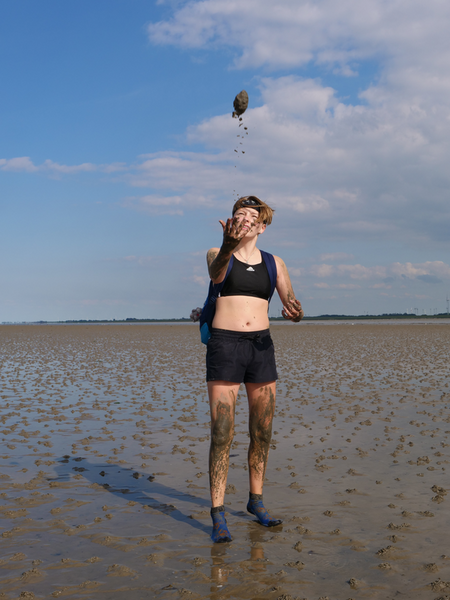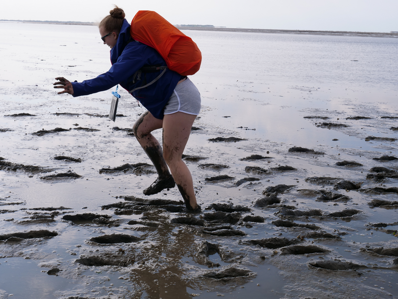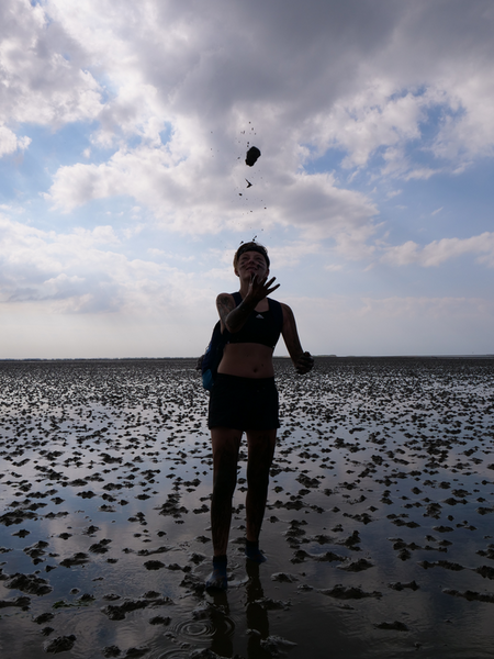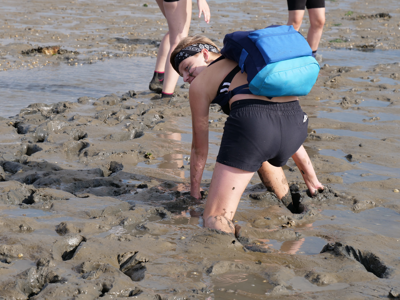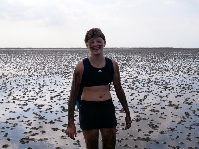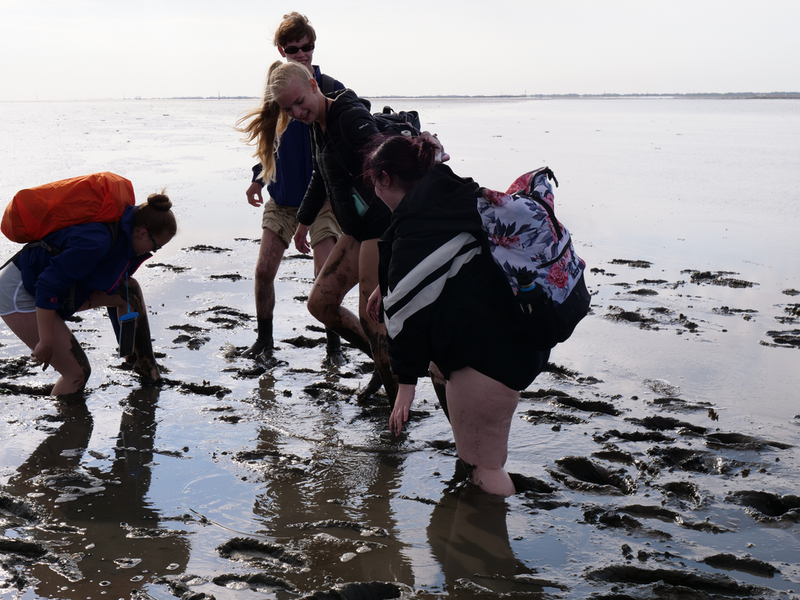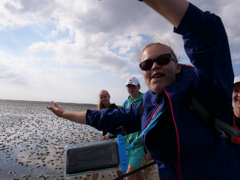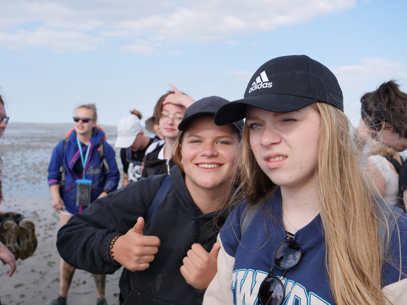 Danach ging es zuerst für die 9bs in das Nationalparkhaus und die Ausstellung „Vom Festland zur Insel“, in der sich alles um den Lebensraum „Wattenmeer“ und dessen Bewohner dreht. Währenddessen machte sich die 9a auf den Weg zu den Salzwiesen, dem Bereich der Küste, der regelmäßig überflutet wird und dennoch zahlreiche Pflanzen und Tiere beheimatet. Hier untersuchten wir, wie sich die Pflanzen an diesen extremen Lebensraum angepasst haben, um überleben zu können. Nach getaner Arbeit gönnten sich viele ein Eis bei der Wärme, von der die Klassenfahrt die ganze Woche begleitet wurde. Im Anschluss ging es mit dem Bus weiter ins Nordseebad nach Norddeich, wo erst einmal Freizeit anstand. Viele ergriffen die Gelegenheit, im Meer zu baden oder um sich später bei Ebbe einer Schlammschlacht mit Herrn Wendt und Herrn Pfennig zu stellen, während andere die Restaurants und Cafés der Stadt besetzten.