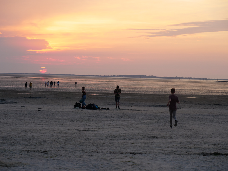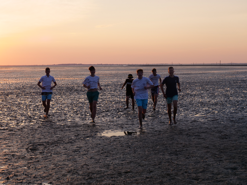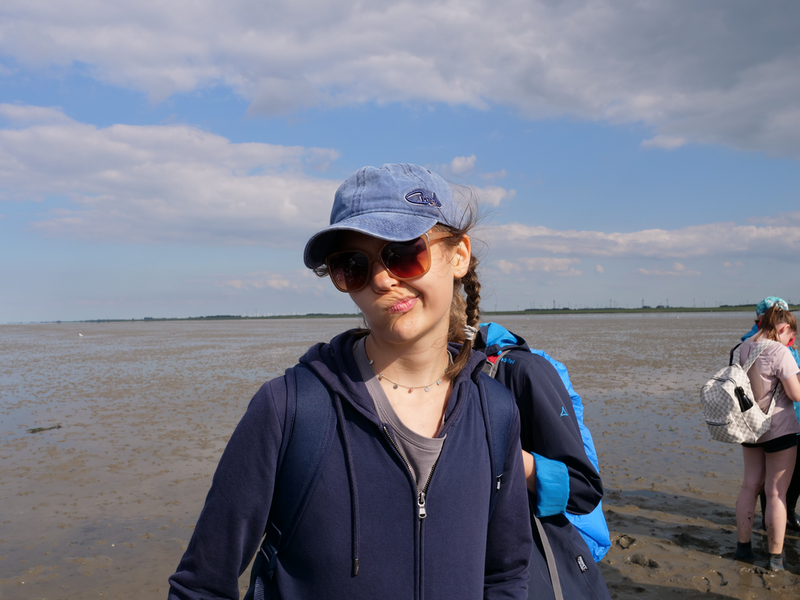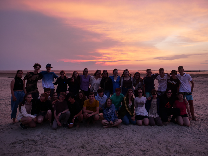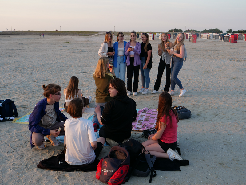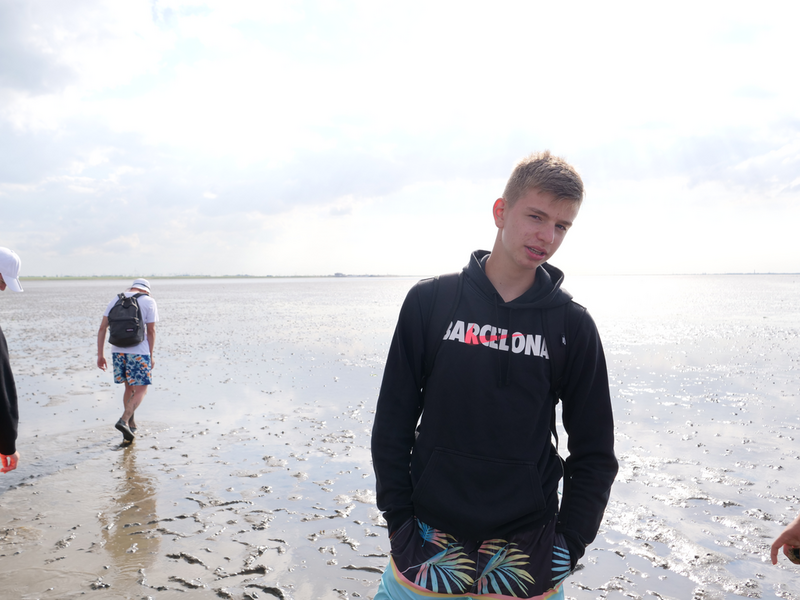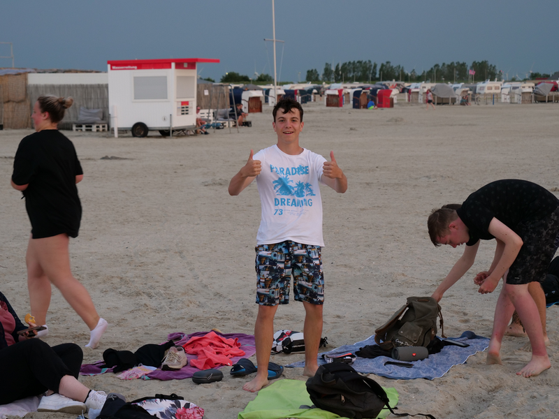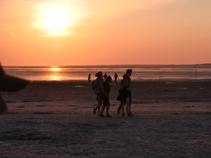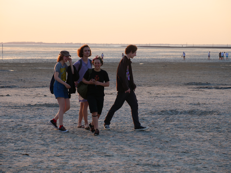 Als der Bus am Strand ankam, machten es sich einige mit Decken und Musik am Strand gemütlich, während andere sofort zum Meer stürzten. Was sich jedoch als schwierig erwies, da gerade kein Wasser da war. Viele liefen also barfuß durch den Schlamm, was Erinnerungen an die Wattwanderung weckte. Am Ende musste sich die Truppe sehr beeilen, da der Strand komischerweise geschlossen wurde. Als wäre das nicht schon genug Aufregung für einen Tag, zog zudem ein mächtiges Gewitter auf. So lief die Gruppe eine Stunde lang, während es immer dunkler und windiger wurde und der Himmel permanent wegen Blitzen aufleuchtete. Letztlich kamen alle gesund, glücklich und trocken wieder an der Herberge an.