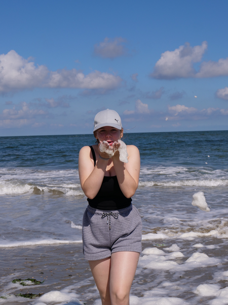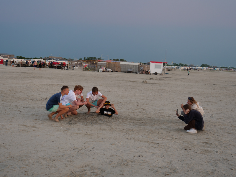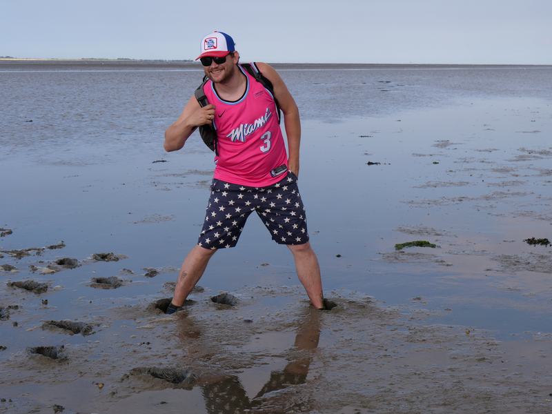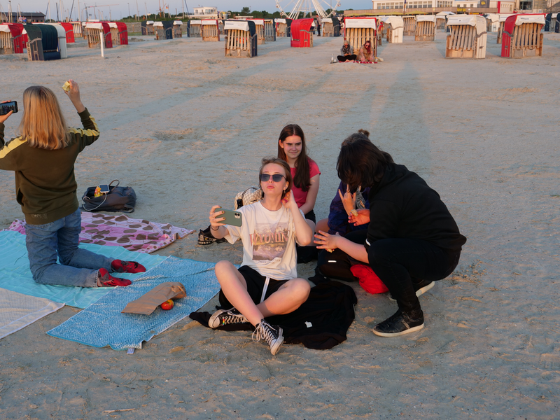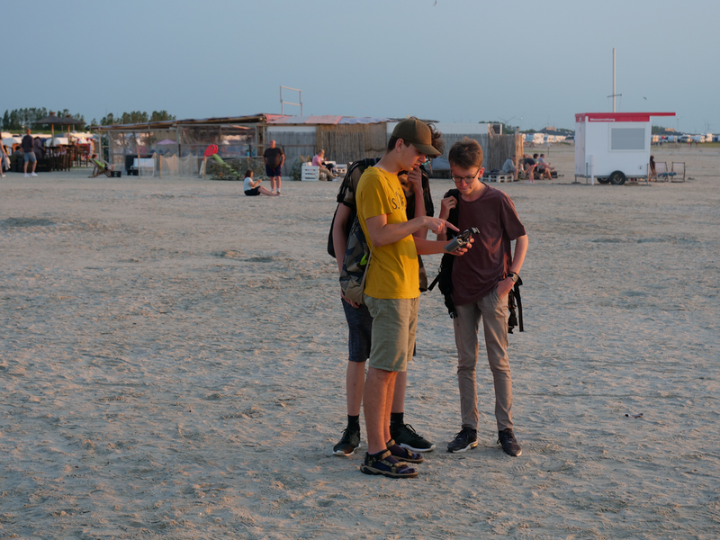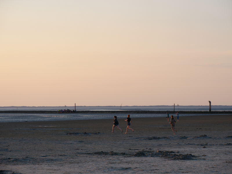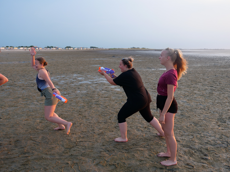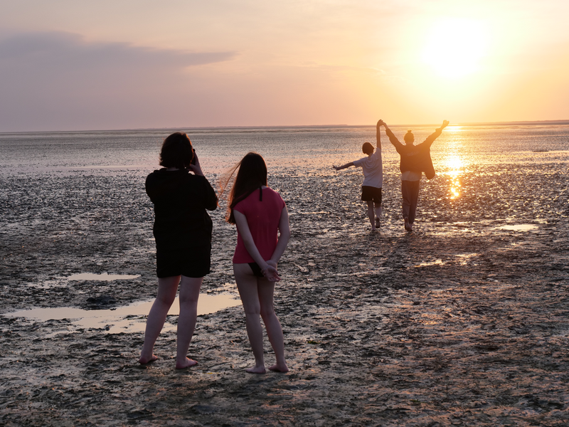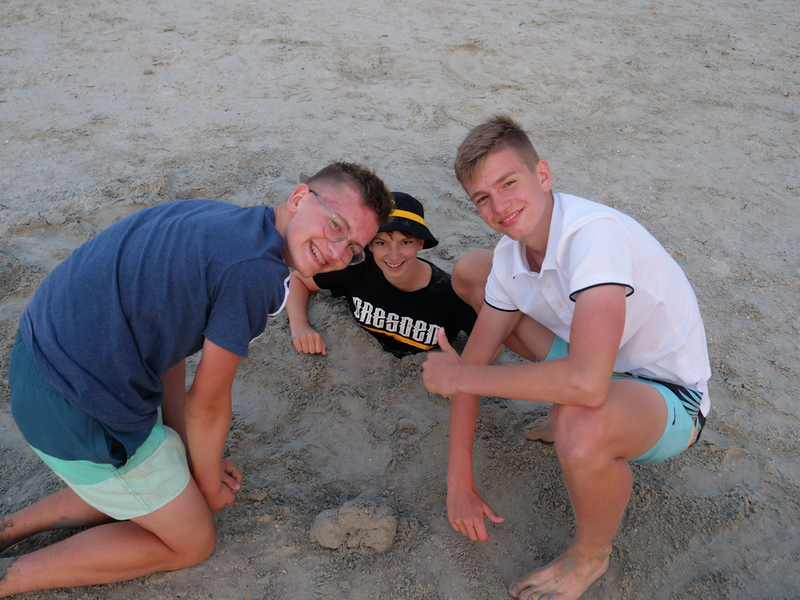 Als der Bus am Strand ankam, machten es sich einige mit Decken und Musik am Strand gemütlich, während andere sofort zum Meer stürzten. Was sich jedoch als schwierig erwies, da gerade kein Wasser da war. Viele liefen also barfuß durch den Schlamm, was Erinnerungen an die Wattwanderung weckte. Am Ende musste sich die Truppe sehr beeilen, da der Strand komischerweise geschlossen wurde. Als wäre das nicht schon genug Aufregung für einen Tag, zog zudem ein mächtiges Gewitter auf. So lief die Gruppe eine Stunde lang, während es immer dunkler und windiger wurde und der Himmel permanent wegen Blitzen aufleuchtete. Letztlich kamen alle gesund, glücklich und trocken wieder an der Herberge an.