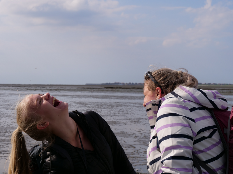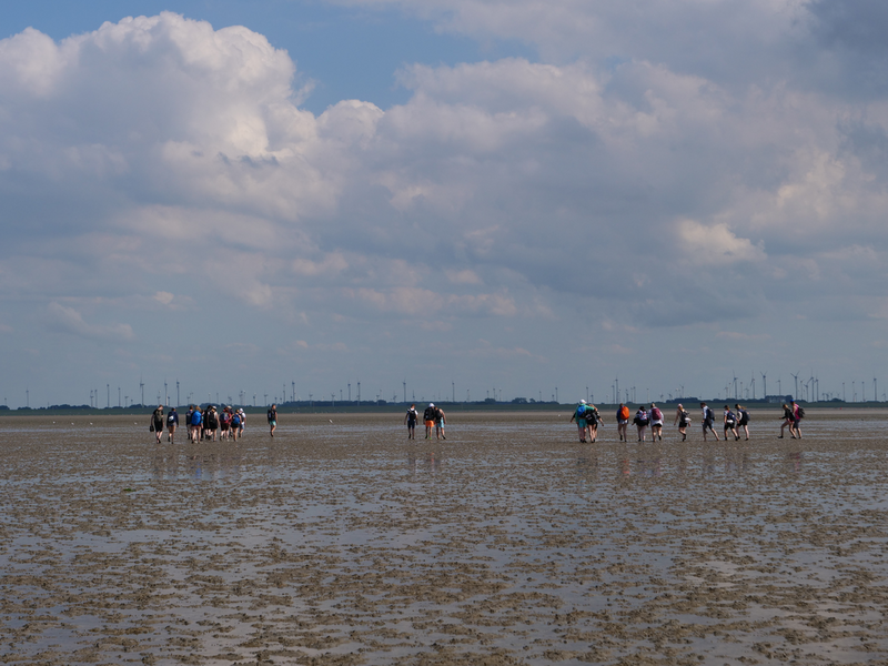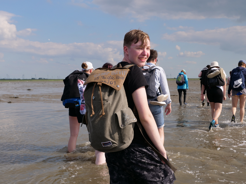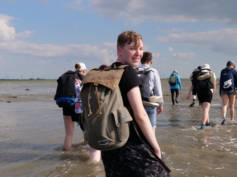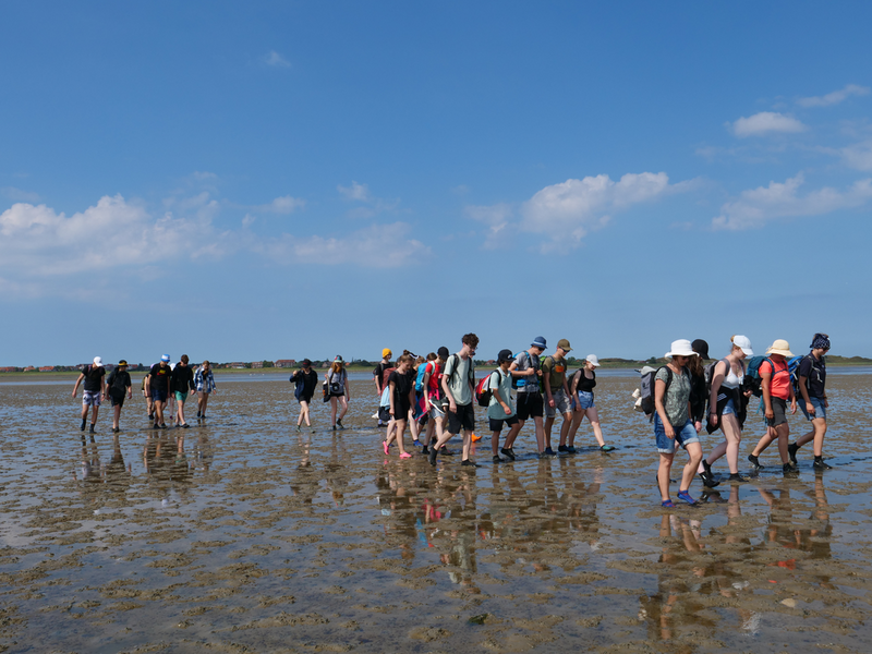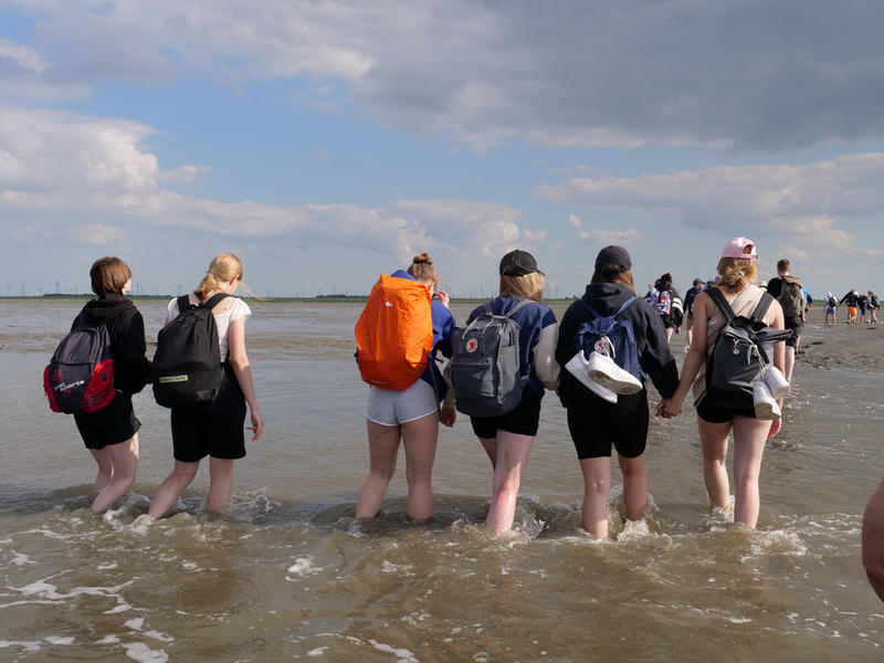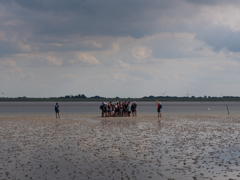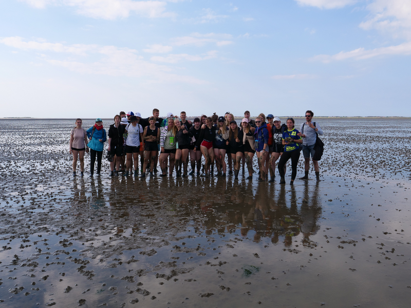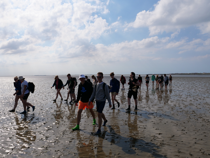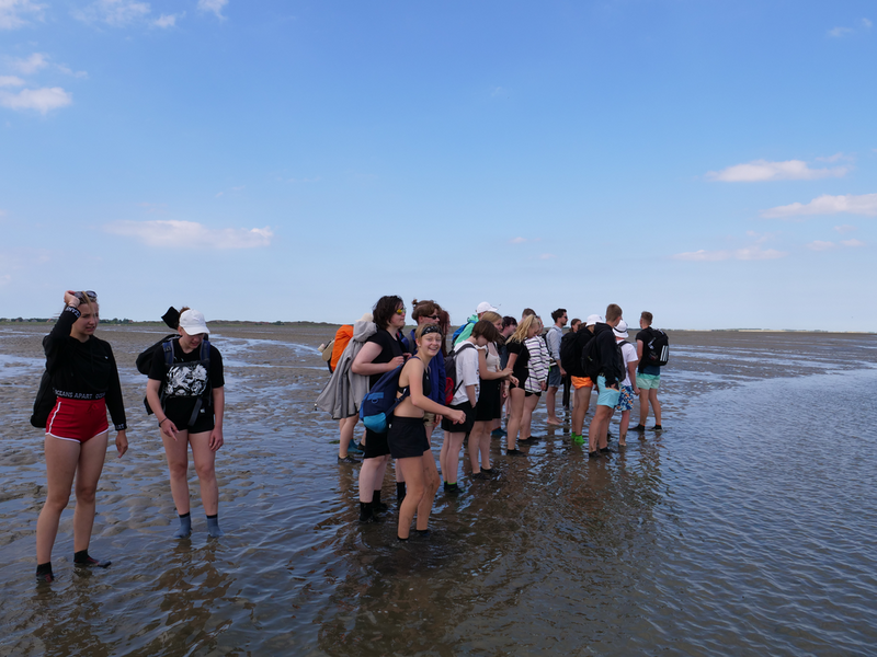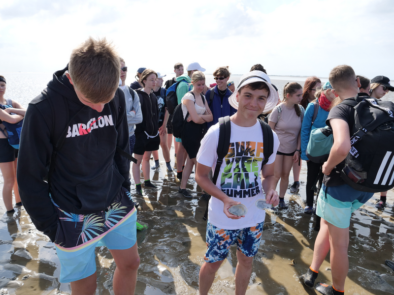 Während wir auf dem Hinweg die 8km zwischen den Häfen Nessmersiel auf dem Festland und Baltrum noch mit der Fähre zurücklegen konnten, erlaubten die Gezeiten es Stunden später, den Weg zu Fuß anzutreten – natürlich unter der fachmännischen Leitung unserer Wattführer. Im Watt angekommen, konnte man lebendige und tote Krabben, Wattwürmer, Muscheln und sogar einen Seestern bestaunen. Auch die tieferen Stellen des Watts, die Priele, konnte man spüren, doch ohne sich großartig nass zu machen, schafften es alle, diese Wasserläufe zu durchqueren. Das Laufen wurde mit der Zeit immer schwieriger und anstrengender, da man immer mehr im Matsch einsank. Kurz vorm Erreichen des Festlandes verdeutlichten die Wattführer noch einmal, wie gefährlich es ist, allein ins Watt zu gehen, da man seinen Orientierungssinn schnell verliert (höchstpersönlich von den Klassen getestet). Erschöpft, aber fasziniert von dieser ganz besonderen Naturlandschaft kehrten wir zur Jugendherberge in Esens zurück. Nun freuten sich alle auf das Abendessen, bevor ein Jedermann dann geschafft ins Bett fiel.