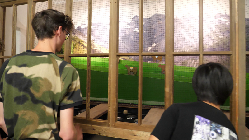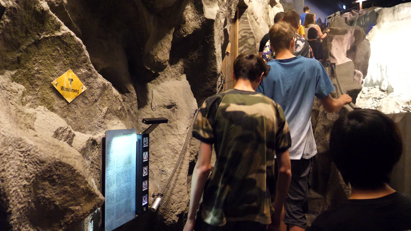 In der Ausstellung „Reise“ durchquert man sieben unterschiedliche Standorte auf dem Längengrad 8°34‘. An diesen sieben Standorten lernt man jeweils eine Familie kennen, diese berichtet über die Lebensbedingungen, Kultur und auch klimatisch bedingte Probleme. Die erste Station unserer Reise war Isenthal in der Schweiz. Hier konnte man eine schön gestaltete Berglandschaft mit Gipfelkreuz und Gletscher bewundern und auch erleben. Neben der Optik wurden auch Themen wie das Gletscherschmelzen und Steinschläge/Erdrutsche vermittelt. Darauf folgten wir dem 8. Längengrad weiter südlich und besuchten Seneghe auf Sardinien. Hier erfuhren wir über Buschbrände und die Auswirkungen des Klimas auf die Natur auf Sardinien. Weiter ging es nach Kanak in Niger. Hier stand das Leben der Menschen in der Wüste im Mittelpunkt. Wir lernten die Tuareg kennen, erfuhren, dass 10% der Bevölkerung Nomaden sind und lernten über die Geschichte der Sahara. Mein persönliches Highlight war Ikenge in Kamerun. Hier nahm man das spezifische Klima am besten wahr. Eine hohe Luftfeuchtigkeit und sehr warme Temperaturen ließen einen fühlen, als wäre man im Regenwald. Neben vielen Tieren in Terrarien, die wir aus der Nähe betrachten konnten, erhielten wir einen Einblick in das Leben der Menschen im Regenwalddorf und deren Rituale.