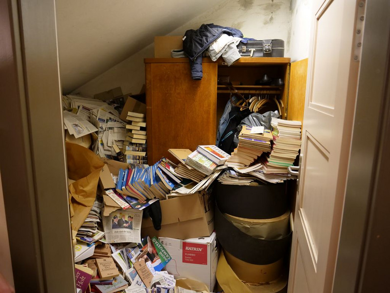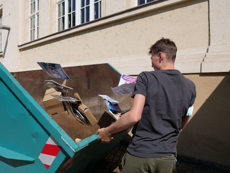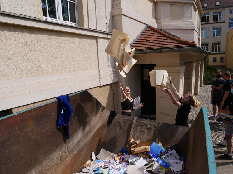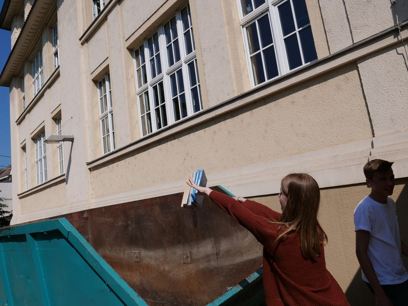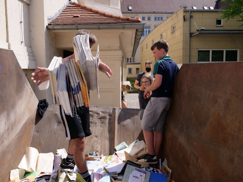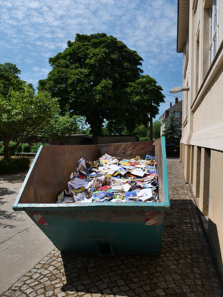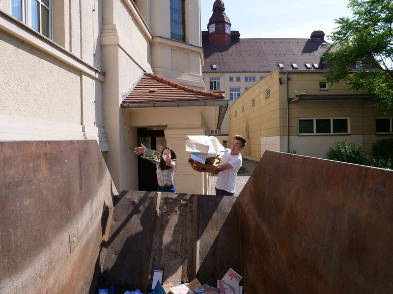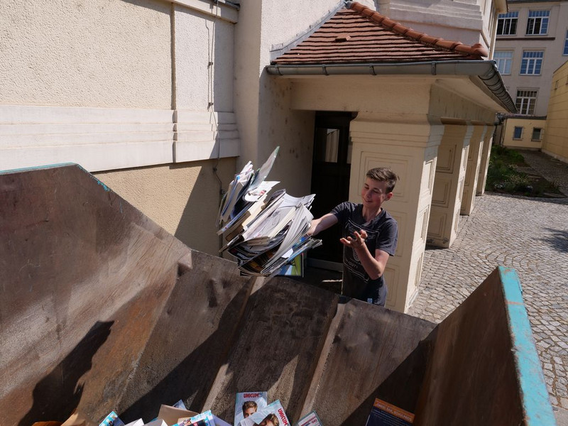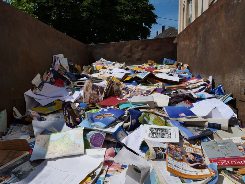 In einem großen Container wurden papierne Abfälle, also diverse ausgemusterte Lehrmaterialien usw. gesammelt.