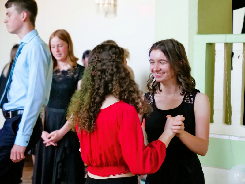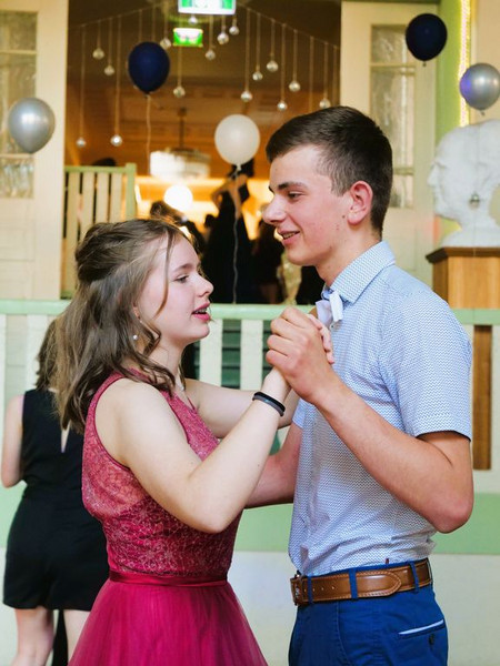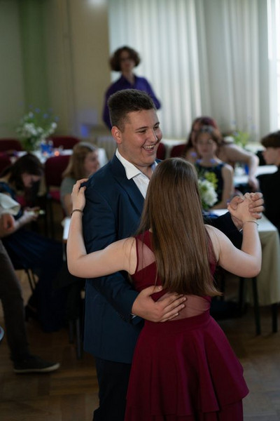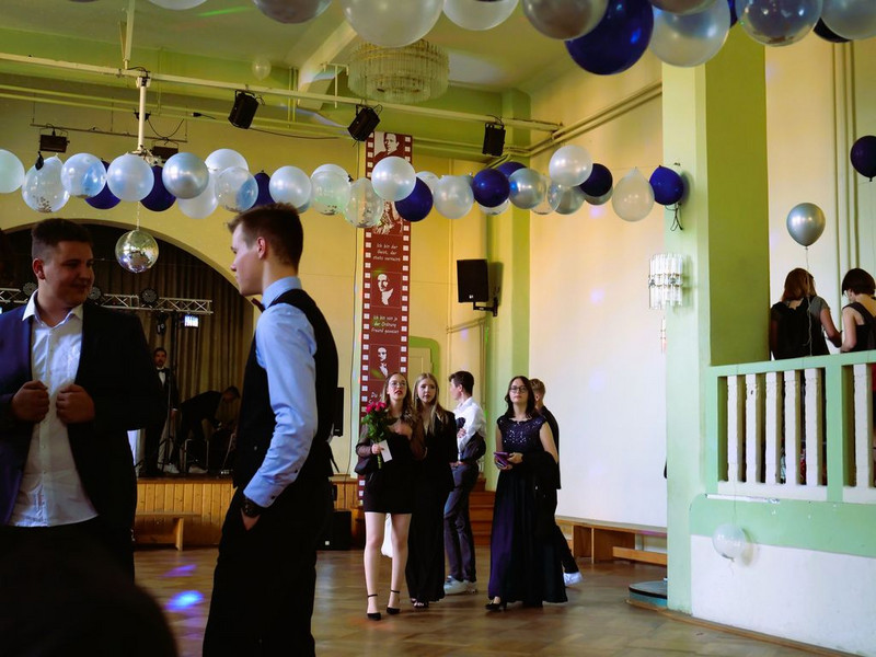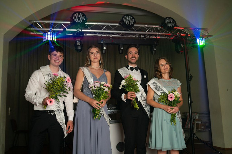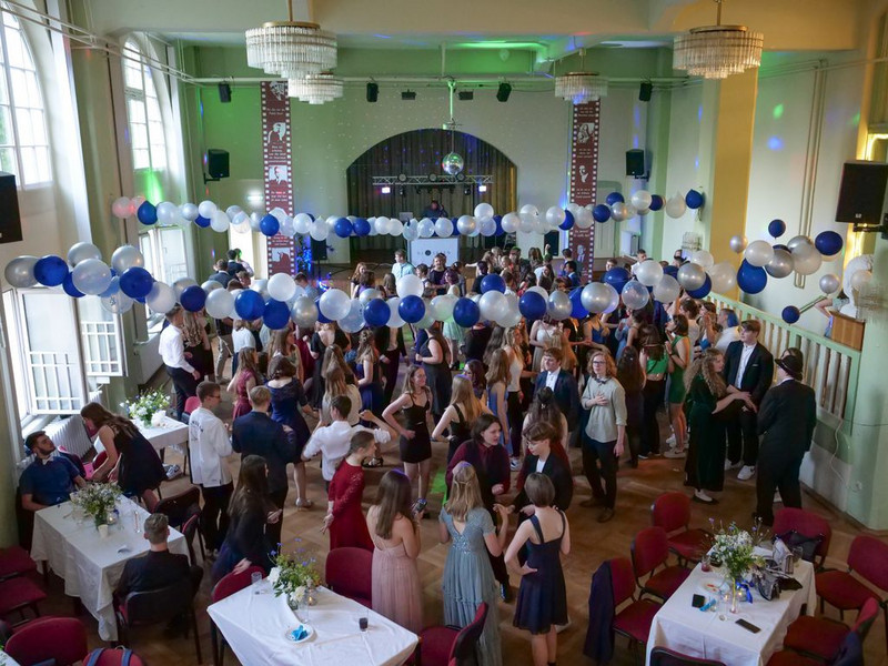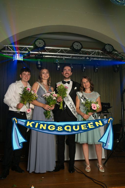 Doch auch damit war an jenem Abend nicht genug, denn wie es sich für einen Prom gehört, stand zum Schluss des Balls noch die Krönung eines Ballkönigs und einer Ballkönigin an – sowohl von der Schüler*innen- als auch von der Lehrer*innen-Seite aus. Diesbezüglich hatte Jeder den gesamten Abend über die Möglichkeit, seine Favoriten auf Zettel zu schreiben und diese Zettel wiederum in eine der vier entsprechenden Stimmzettelboxen zu werfen. Um 21:30 Uhr wurde die Wahl beendet und die Stimmen ausgezählt, sodass es ca. 21:45 Uhr zur feierlichen Kürung der beiden Ballkönige und Ballköniginnen kommen konnte. Zuerst erfolgte die Verkündigung des Ballkönigs der Lehrer . . . hierbei fiel die Wahl nicht ganz unüberraschend auf den Moderator des Abends: Herrn Wendt! Als seine Ballkönigin wählten die Prom-Gäste diejenige, die zu großen Teilen dazu beitrug, dass jener Ball überhaupt stattfinden konnte: Frau Degen! Anschließend wurden auch der Ballkönig und die Ballkönigin von uns Schülern verkündet . . . in diesem Fall fiel die Wahl auf zwei Elft-Klässler*innen: Anton König und Lana Nike Illgen! Die vier Auserwählten wurden nach ihrer gewonnenen Wahl mit Blumen beschenkt und durften - ganz traditionell - den nächsten Tanz eröffnen, dem schließlich auch die anderen Prom-Gäste beiwohnen konnten. Dies war leider auch das letzte große Highlight an jenem Abend, da der Ball nur kurze Zeit später, um 22.00 Uhr, sein Ende fand. Natürlich wurde die Tanzfläche bis zur letzten Sekunde voll ausgenutzt, sodass sich beim letzten Tanz zum Lied „Monster“ wirklich jeder auf dem Parkett befand.