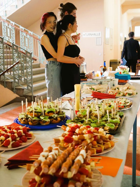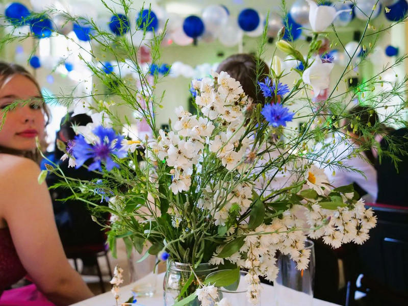 An diesem Tag verwandelte sich unsere Aula durch vielfältigen Blumen- und Ballonschmuck zur Party-Location. Ab 17:30 Uhr wurden die ersten Gäste – natürlich nur unter Vorzeigen der vorher verteilten Tickets – eingelassen. Bevor sie sich im Saal der Aula platzieren konnten, wurden sowohl Schüler*innen, als auch Lehrer*innen mit leckeren Speisen und Getränken, die die Schülerinnen und Schüler der 12. Klasse vorbereitet hatten, begrüßt, und konnten sich auch im weiteren Verlauf des Abends stets gegen wenig Geld bedienen. Um 18:00 Uhr wurde der erste Prom des WHG feierlich von Herrn Wendt, dem Moderator des Abends, eröffnet.