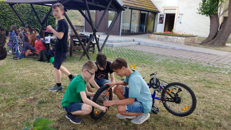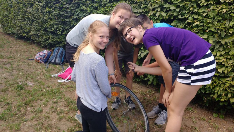 Damit beschäftigten sich die Schülerinnen und Schüler der Klasse 6bs an einem Projekttag in der letzten Schulwoche des Schuljahrs 2018/19. An fünf alten Fahrrädern wurden die Räder ausgebaut, die Fahrradmäntel von der Felge gehoben und die Schläuche aus dem Mantel gezogen. Als nächstes wurde geflickt. Die Schläuche nun wieder in die Mäntel fädeln und diese auf die Felge bringen. Ganz schön knifflig! Einige bewiesen hier viel Geduld und handwerkliches Geschick. Nach dem Luftaufpumpen machte die anschließende Probefahrt besonders viel Spaß.