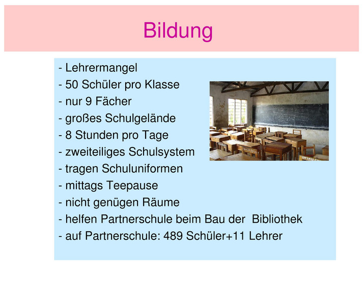 Am 25. August 2014 hob der Flieger nach Tansania in Deutschland ab. Annemarie Oßmann, Maria Odoj und Marina Keil saßen in der Maschine mit rund 8000 € Spenden im Gepäck. Sie waren auf dem Weg zur Kome Secondary School. Diese liegt auf einer kleinen Insel im Viktoriasee, welche nur mit dem Boot zu erreichen ist. Seit 2004 ist die Kome Secondary School die Partnerschule unseres Gymnasiums. Auf der Insel herrschen Verhältnisse, die wir uns in Deutschland nur noch schwer vorstellen können. Es gibt kein fließend Wasser, keinen Strom, und die Tische und Stühle sind von schlechter Qualität. Für fast 500 Schüler stehen nur 10 Lehrer zur Verfügung. Dadurch sind die Lernbedingungen nicht mit unseren zu vergleichen und dadurch leidet die Bildung der Schüler und Schülerinnen.
