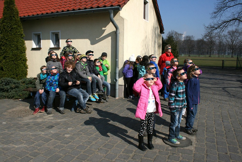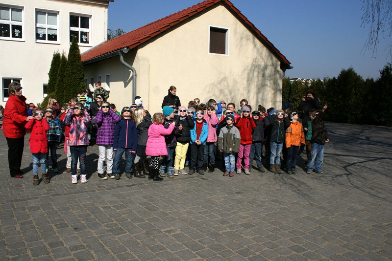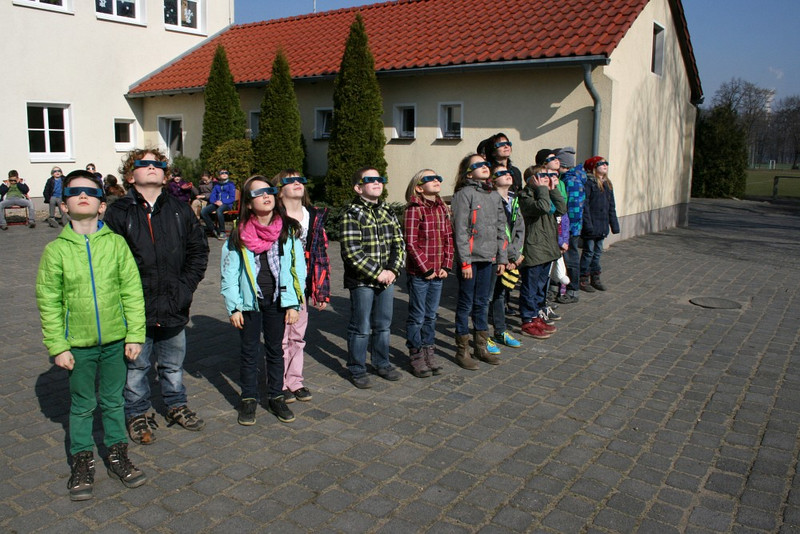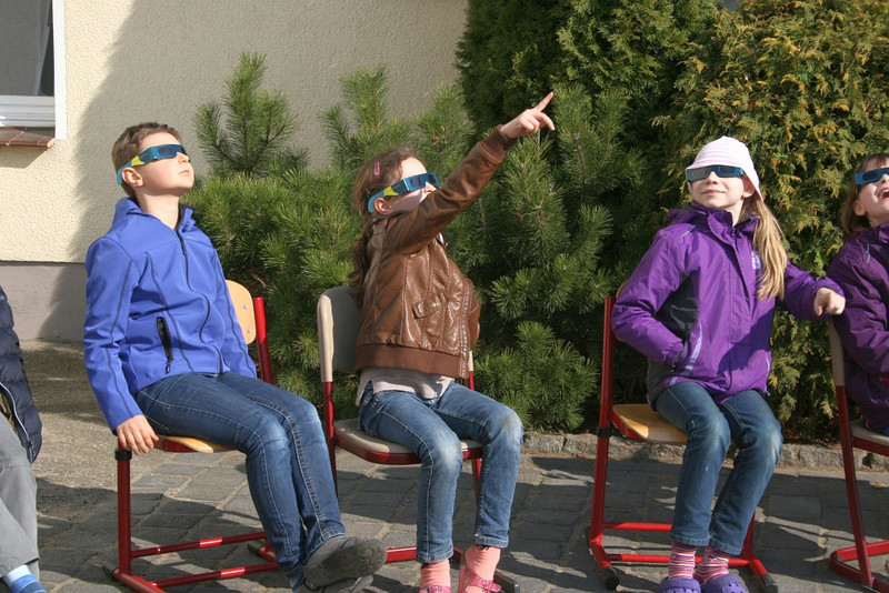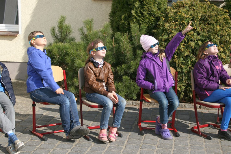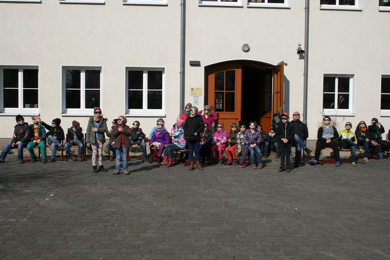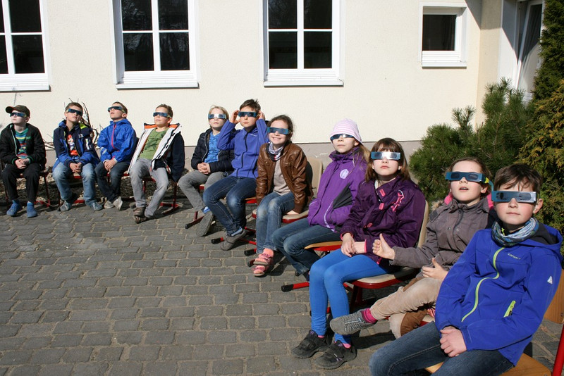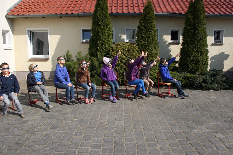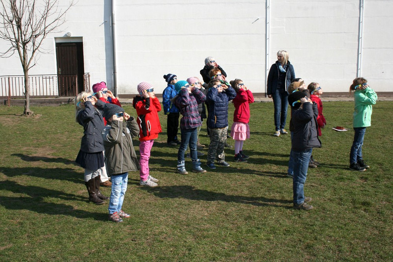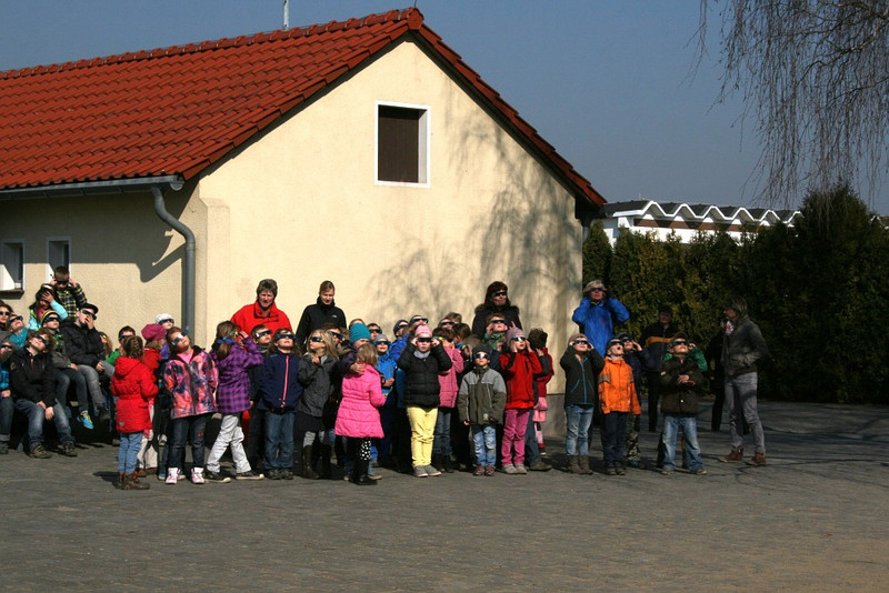 Zum Frühlingsanfang 2015, am 20.März, konnten wir mit allen Schülern das seltene Himmelsereignis einer teilweisen(partiellen) Sonnenfinsternis erleben. Ausgestattet mit SoFi- Schutzbrillen, die wirklich gut sind, konnten unsere Schüler die langsam fortschreitende Bedeckung der Sonne durch den Mond, untermalt mit vielen Ahs und Ohs, erleben. Zur größten Abdeckung in der Zeit von 10.15 Uhr bis 10.50 Uhr waren die die Mädchen und Jungen Klassen 1 bis 3 auf dem Schulhof versammelt und beobachteten gespannt dieses Ereignis, in echt, nicht am PC oder Bildschirm! Die Klassen 4, ausgestattet mit ihren Brillen, weilten in Dresden zu einem Erich Kästner Projekt.