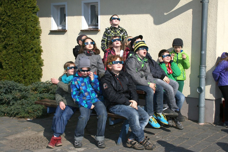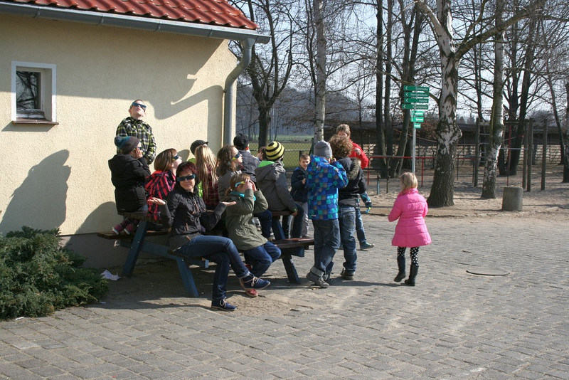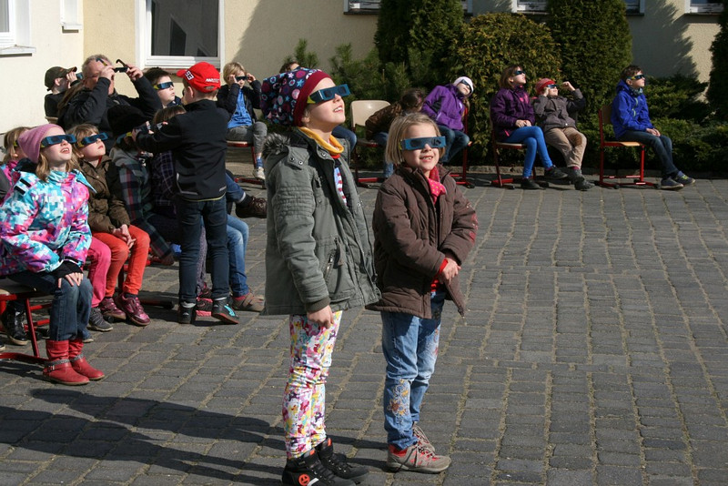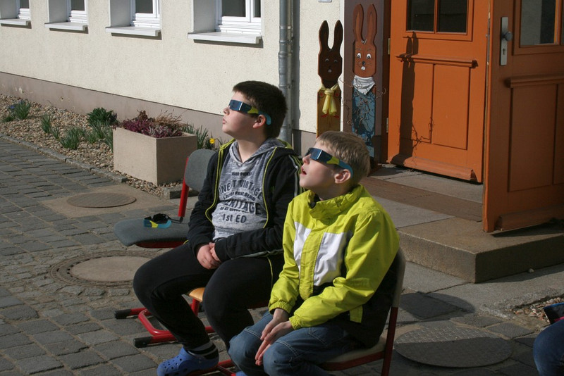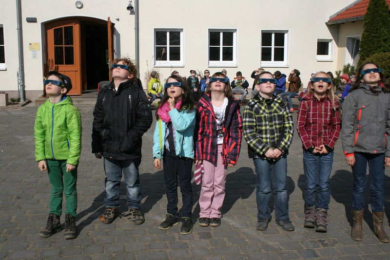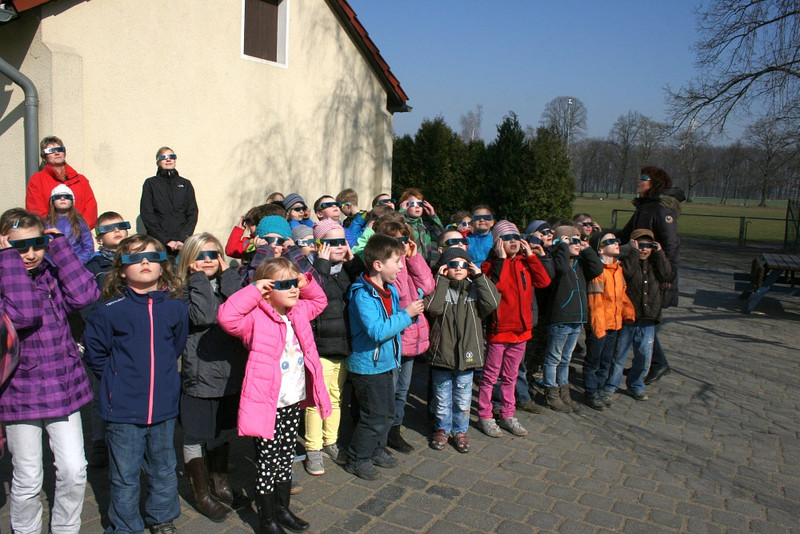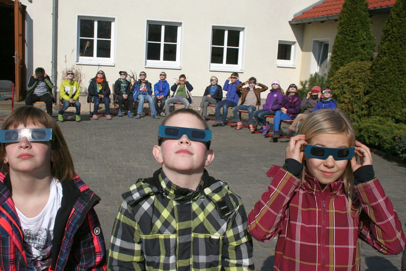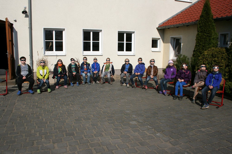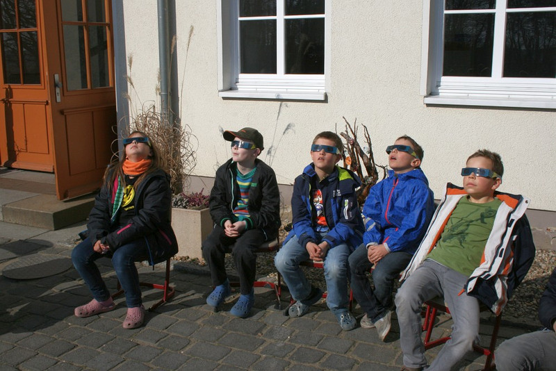 Zum Frühlingsanfang 2015, am 20.März, konnten wir mit allen Schülern das seltene Himmelsereignis einer teilweisen(partiellen) Sonnenfinsternis erleben. Ausgestattet mit SoFi- Schutzbrillen, die wirklich gut sind, konnten unsere Schüler die langsam fortschreitende Bedeckung der Sonne durch den Mond, untermalt mit vielen Ahs und Ohs, erleben. Zur größten Abdeckung in der Zeit von 10.15 Uhr bis 10.50 Uhr waren die die Mädchen und Jungen Klassen 1 bis 3 auf dem Schulhof versammelt und beobachteten gespannt dieses Ereignis, in echt, nicht am PC oder Bildschirm! Die Klassen 4, ausgestattet mit ihren Brillen, weilten in Dresden zu einem Erich Kästner Projekt.