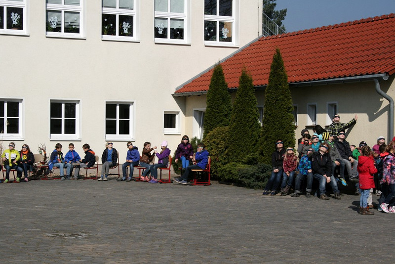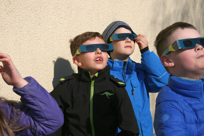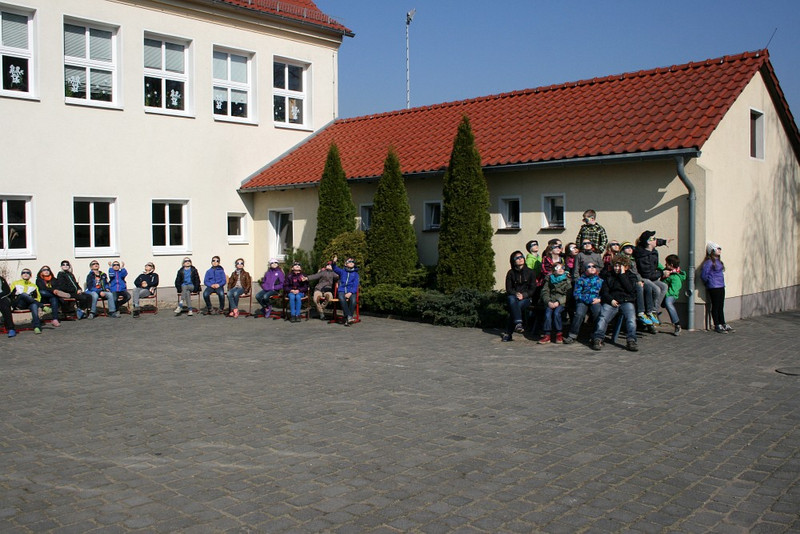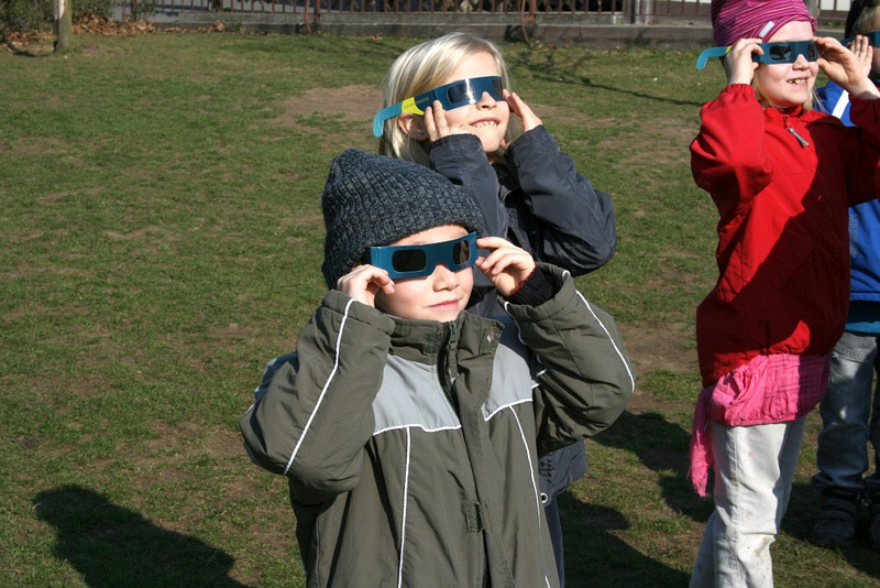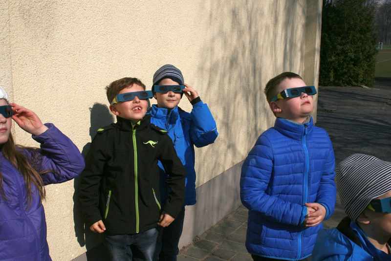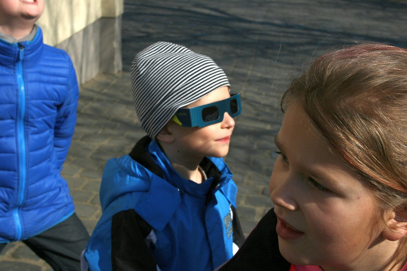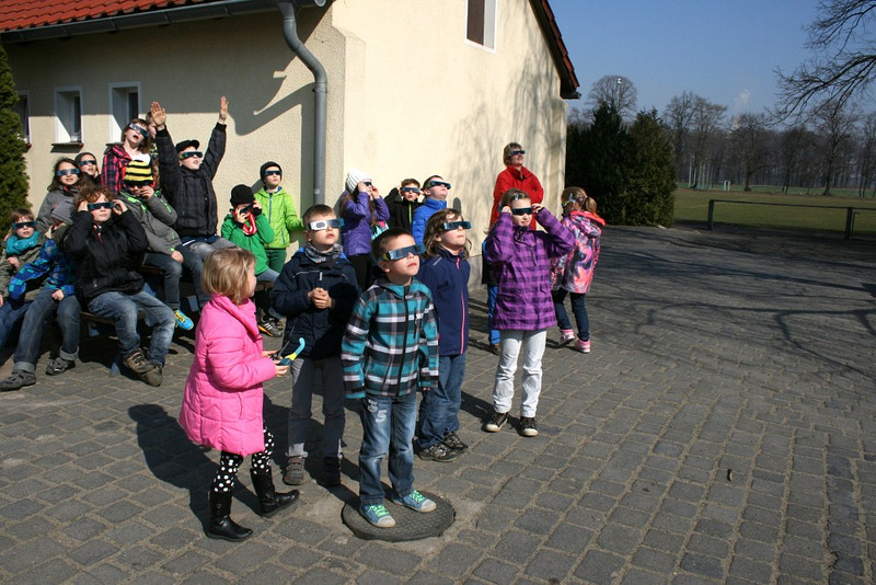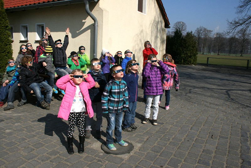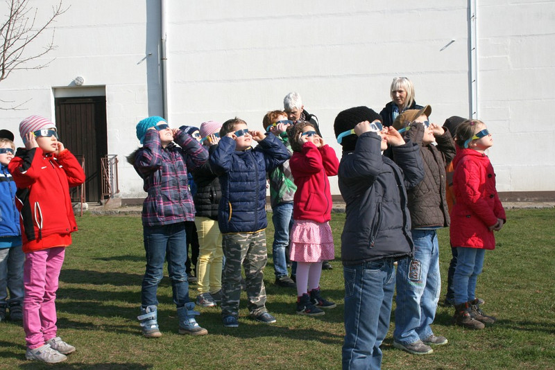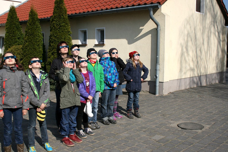 Zum Frühlingsanfang 2015, am 20.März, konnten wir mit allen Schülern das seltene Himmelsereignis einer teilweisen(partiellen) Sonnenfinsternis erleben. Ausgestattet mit SoFi- Schutzbrillen, die wirklich gut sind, konnten unsere Schüler die langsam fortschreitende Bedeckung der Sonne durch den Mond, untermalt mit vielen Ahs und Ohs, erleben. Zur größten Abdeckung in der Zeit von 10.15 Uhr bis 10.50 Uhr waren die die Mädchen und Jungen Klassen 1 bis 3 auf dem Schulhof versammelt und beobachteten gespannt dieses Ereignis, in echt, nicht am PC oder Bildschirm! Die Klassen 4, ausgestattet mit ihren Brillen, weilten in Dresden zu einem Erich Kästner Projekt.