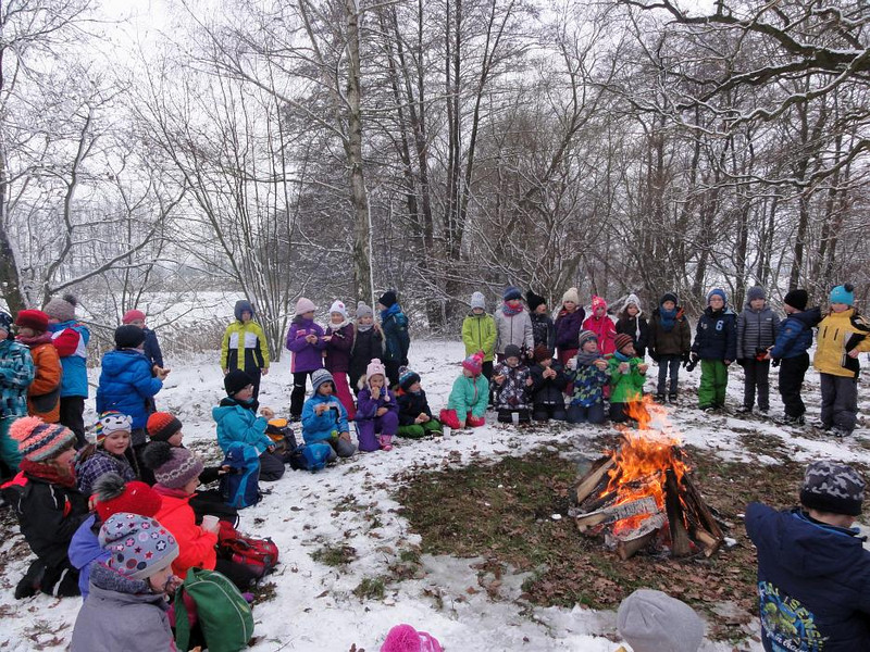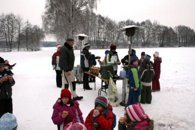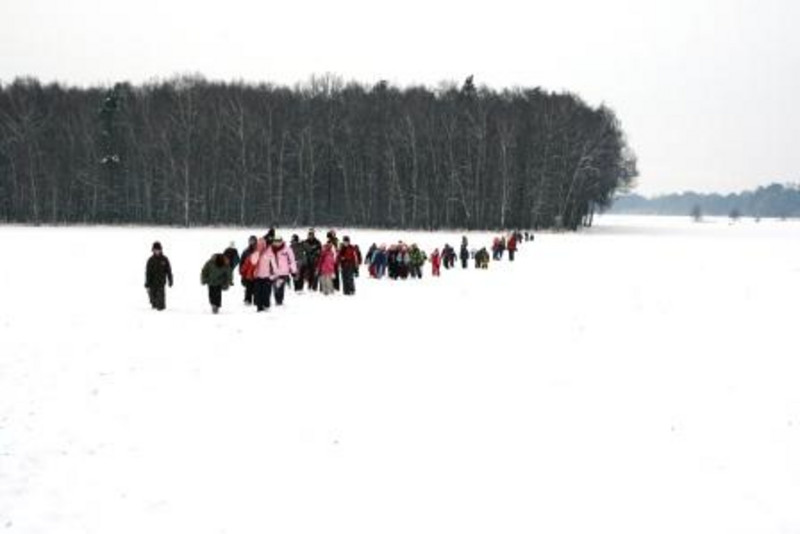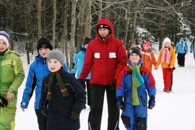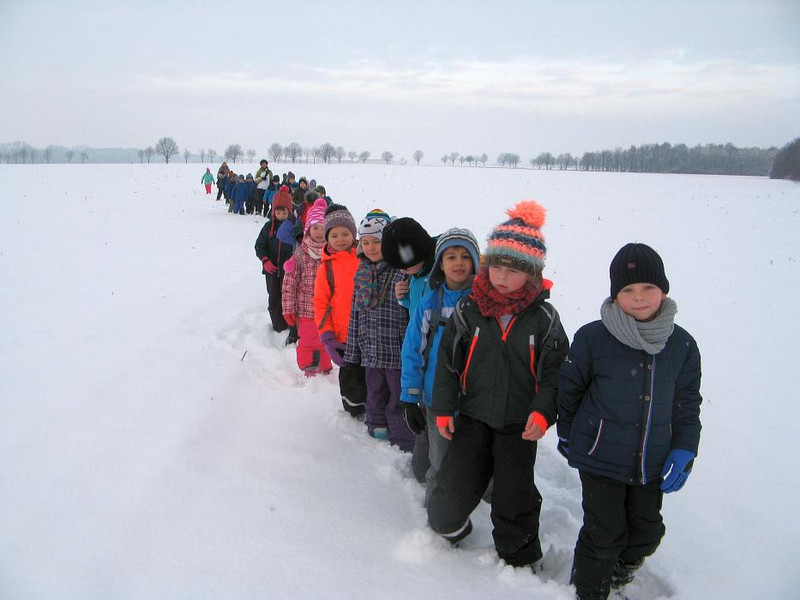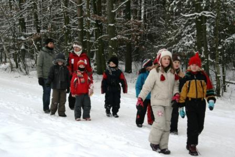 Während die Kleinen der 1. und 2. Klasse ihre Wanderung in der Nähe des ersten Zieles - dem Vierteich - begannen, hatten die 3. und 4. Klassen einen weiteren Weg bis dahin zu bewältigen. Sie liefen von Rödern durch den verschneiten Wald bis zum ersten Treffpunkt.