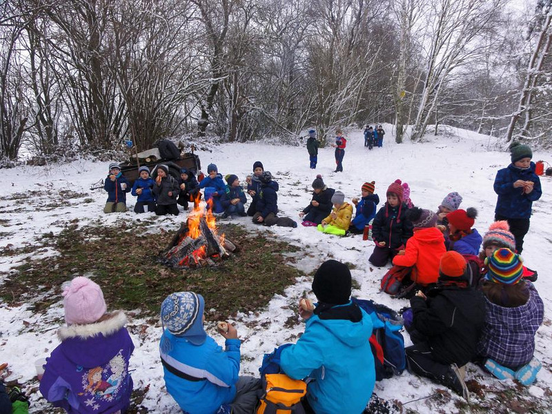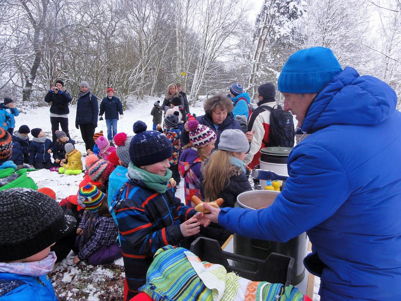 Dort am Vierteich erwartete alle zur Belohnung ein kleines, wärmendes Feuer, warmer Tee, Wiener, Bockwurst und ein frisches Bicknäse- Brötchen.